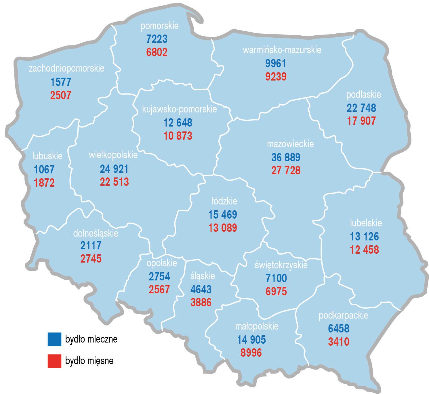 Podobny, choć nie identyczny układ widać w bydle mięsnym. Również tutaj pierwsze miejsce zajmuje Mazowsze z wynikiem 27 728 stad. Wysoko plasują się też Wielkopolska, z 22 513 stad, oraz Podlaskie, gdzie zanotowano 17 907 stad. Silną pozycję mają również Łódzkie, Lubelskie i Kujawsko-Pomorskie. Zwraca uwagę fakt, że w części województw skala chowu bydła mięsnego zbliża się do poziomu notowanego w mleczarstwie, co może świadczyć o rosnącym znaczeniu dywersyfikacji produkcji.