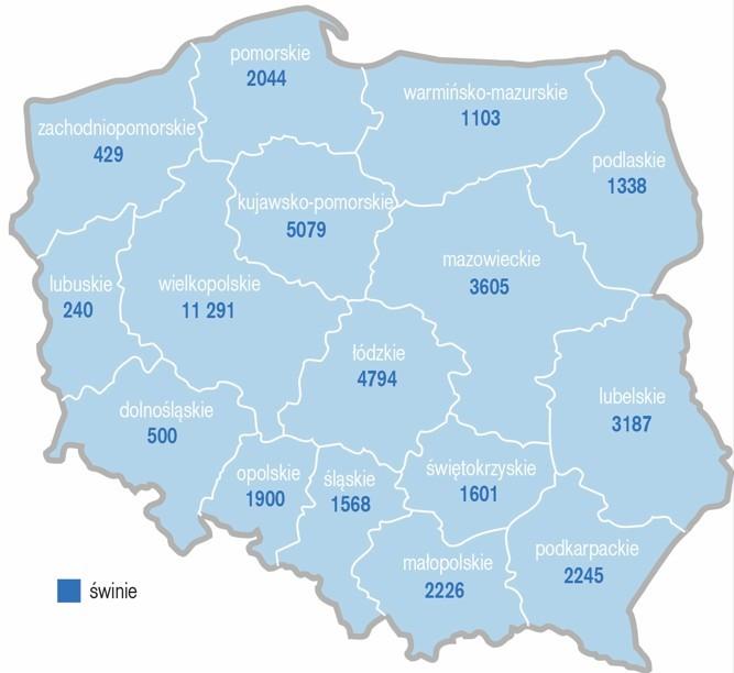 W trzodzie chlewnej układ regionalny jest już bardziej skoncentrowany. Bezapelacyjnym liderem jest Wielkopolska, gdzie liczba stad świń wyniosła 11 291. To ponad dwukrotnie więcej niż w drugim Kujawsko-Pomorskiem, które osiągnęło 5079 stad, i wyraźnie więcej niż w Łódzkiem z wynikiem 4794. Niemniej świńskich gospodarstw sukcesywnie z każdym rokiem ubywa. A to na skutek nakładających się czynników w postaci ASF, a co za tym idzie inwestycji w bioasekurację, wysokich kosztów paszy, czy dużych wahań na rynku świń.