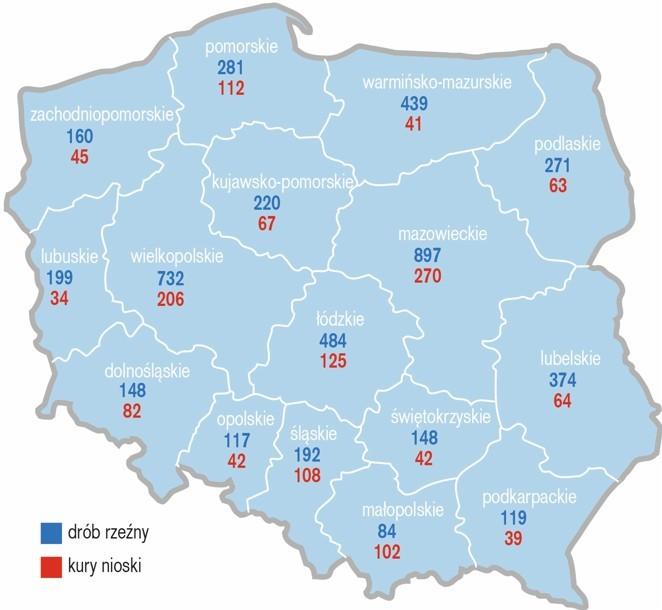 W drobiu ogółem najmocniejszą pozycję ma Mazowsze z 1432 hodowli. Za nim plasuje się Wielkopolska oraz Łódzkie, a wysokie wyniki notują również Warmińsko-Mazurskie, Lubelskie i Pomorskie. Jeszcze wyraźniej przewaga Mazowsza zaznacza się w hodowli drobiu rzeźnego, gdzie województwo to może pochwalić się 897 hodowli.