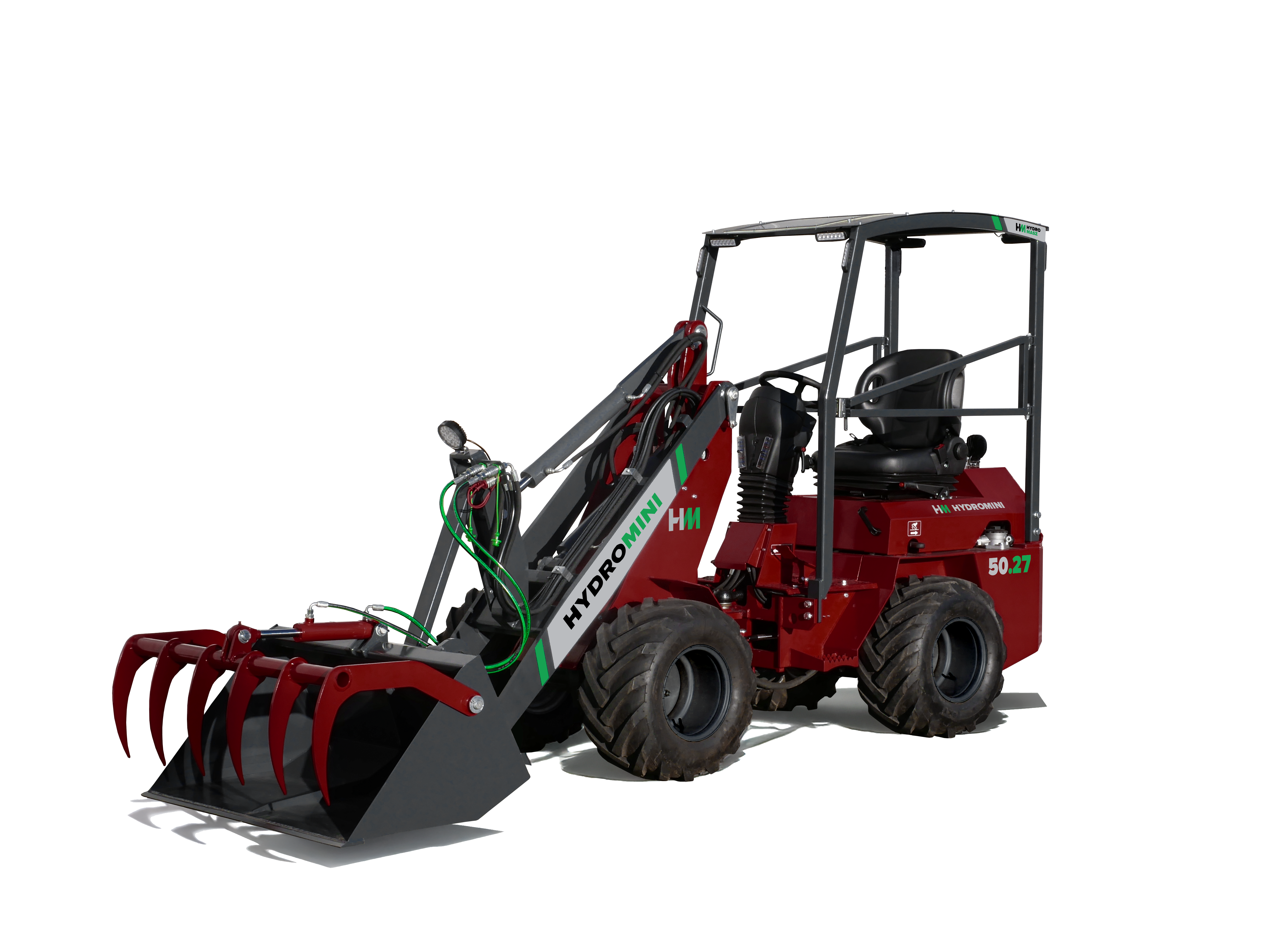 Ładowarka Hydro-Masz Hydromini 50.27 przeznaczona jest do mniejszych gospodarstw z produkcją zwierzęcą. Maszyna wyposażona jest w 3-cylindrowy silnik Yanmar o mocy 26 KM. Model Hydromini 50.27 ma 115 cm szerokości, 500 kg udźwigu i maksymalnie podniesie ramię na 2,7 m. Ładowarka wyposażona jest w pompę hydrauliczną o wydatku 48 l/min. Do wyboru jest szerokie lub wąskie ogumienie. Poza tym ma pedał nożny jazdy przód/tył, ramkę SMS czy sterowanie za pomocą joysticka.