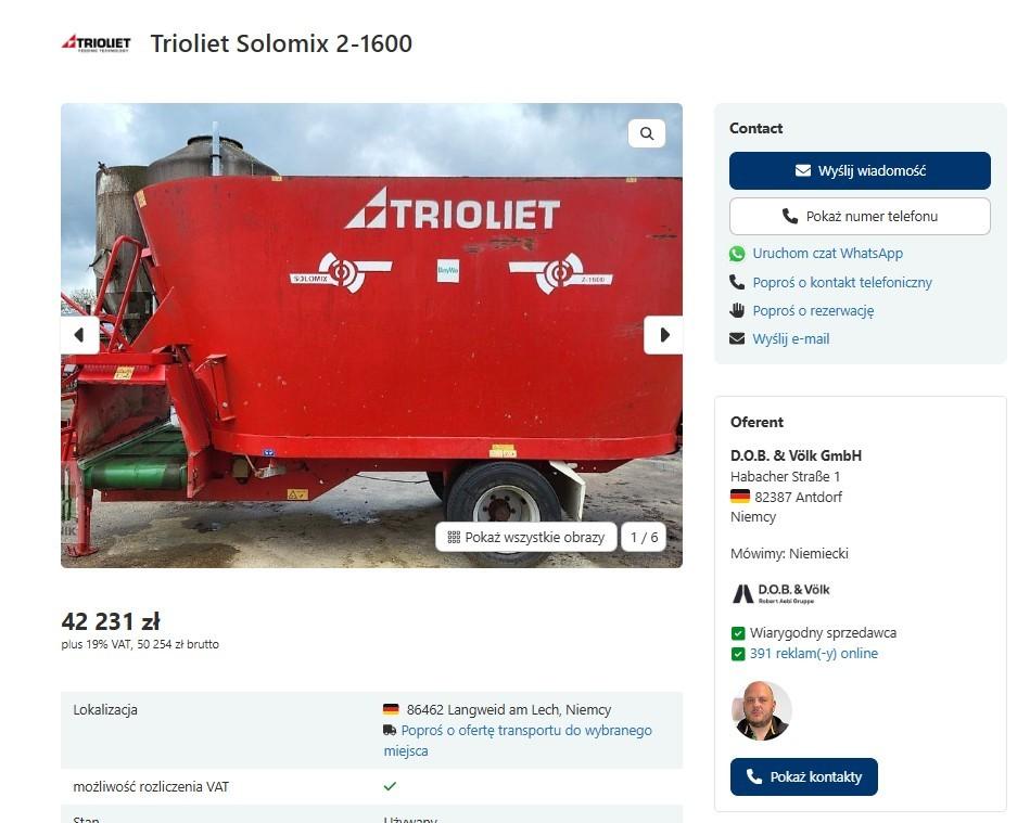Trioliet Solomix 2-1600 to pionowy wóz paszowy z dwoma ślimakami mieszającymi. Każdy z nich wyposażony jest w 4 noże tnące. Pojemność zbiornika w wozie Solomix 2-1600 wynosi 16 m3. Maszyna ma taśmę rozładowczą umieszczoną po obu stronach, podwójne opony, podest roboczy, wagę czy pierścień przeciw wypadaniu paszy. Paszowóz z 2012 r. kosztuje 50 tys. zł brutto.