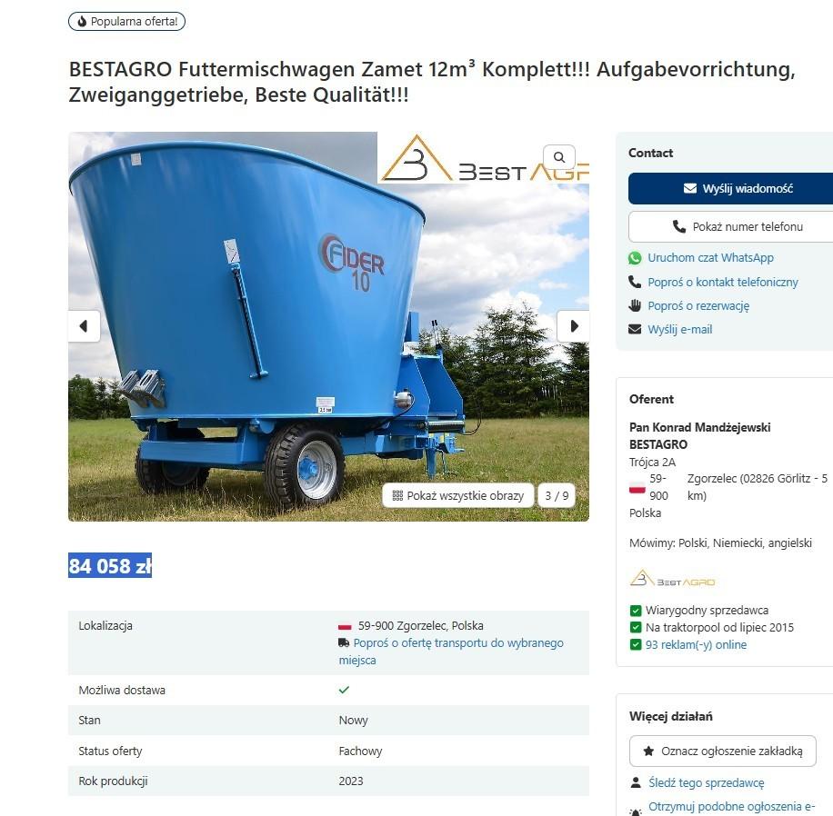 Szukających nieco większej maszyny może zainteresować ogłoszenie z wozem Zamet Fider o pojemności 12 m3. Najważniejsze cechy tego wozu to pionowy ślimak z 12 nożami, dwubiegowa przekładnia, waga czy dwustronny wyładunek paszy z przodu. Poza tym paszowóz ma podest ze schodami, pierścień zabezpieczający przed wypadaniem paszy czy dodatkowe przeciwnoże. Wóz ma 2,3 ms szerokości i 2,94 m wysokości. Co istotne maszyna jest z 2023 r, ale jest sprzedawana jak nieużywana. Cena wozu Zamet wynosi 84 tys. zł.