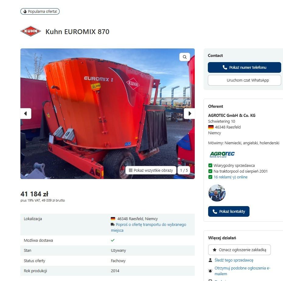 Wóz paszowy Kuhn Euromix 870 o poj. 8 m3 wyposażony jest w pojedynczy ślimak, kamerę, wagę, zasuwy po obu stronach maszyny, ogumienie w rozmiarze 400/60 15.5 oraz nowy przenośnik taśmowy. 11 letni paszowóz wyceniony jest na nieco ponad 41 tys. zł netto.