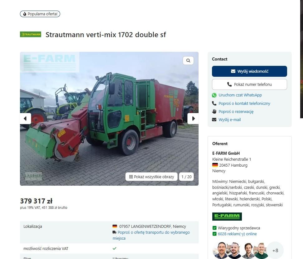 Ciekawą propozycją jest samojezdny wóz paszowy Strautmann Verti-Mix 1702 Double SF z 2019 r. Maszynę napędza 6-cylindrowy silnik John Deere o mocy 175 KM. Paszowóz ma frez o szerokości 2 m z 60 nożami tnącymi, zbiornik o pojemności 17 m3 z dwoma ślimakami, 4 koła skrętne oraz tylny napęd z możliwością jazdy do 20 km/h. Poza tym Strautmann Verti-Mix wyposażony jest w pneumatyczny fotel, radio, kamerę cofania i wagę. Warto wspomnieć o centralnym układzie smarowania oraz ledowych reflektorach. Cena samojezdne maszyny wynosi 379 tys. zł netto.