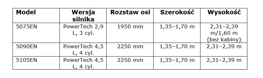 Nowa seria ciągników John Deere 5EN obejmuje modele 5075EN, 5090EN i 5105EN. Jak zaznacza producent, traktory przeznaczone są do pracy w wąskich rzędach i niskich przejazdach. Dostępne są modele z rozstawem osi 1,95 m lub 2,25 m i szerokością od 1,35 do 1,7 m. Ciągniki 5EN wyposażone są w silniki PowerTech o poj. 2,9 i 4,5 l i zapewniają do 106 KM. Co istotne, model 5075EN nie wymaga używania AdBlue, natomiast większe modele mają zużycie na poziomie 3%, co obniża koszty eksploatacji.