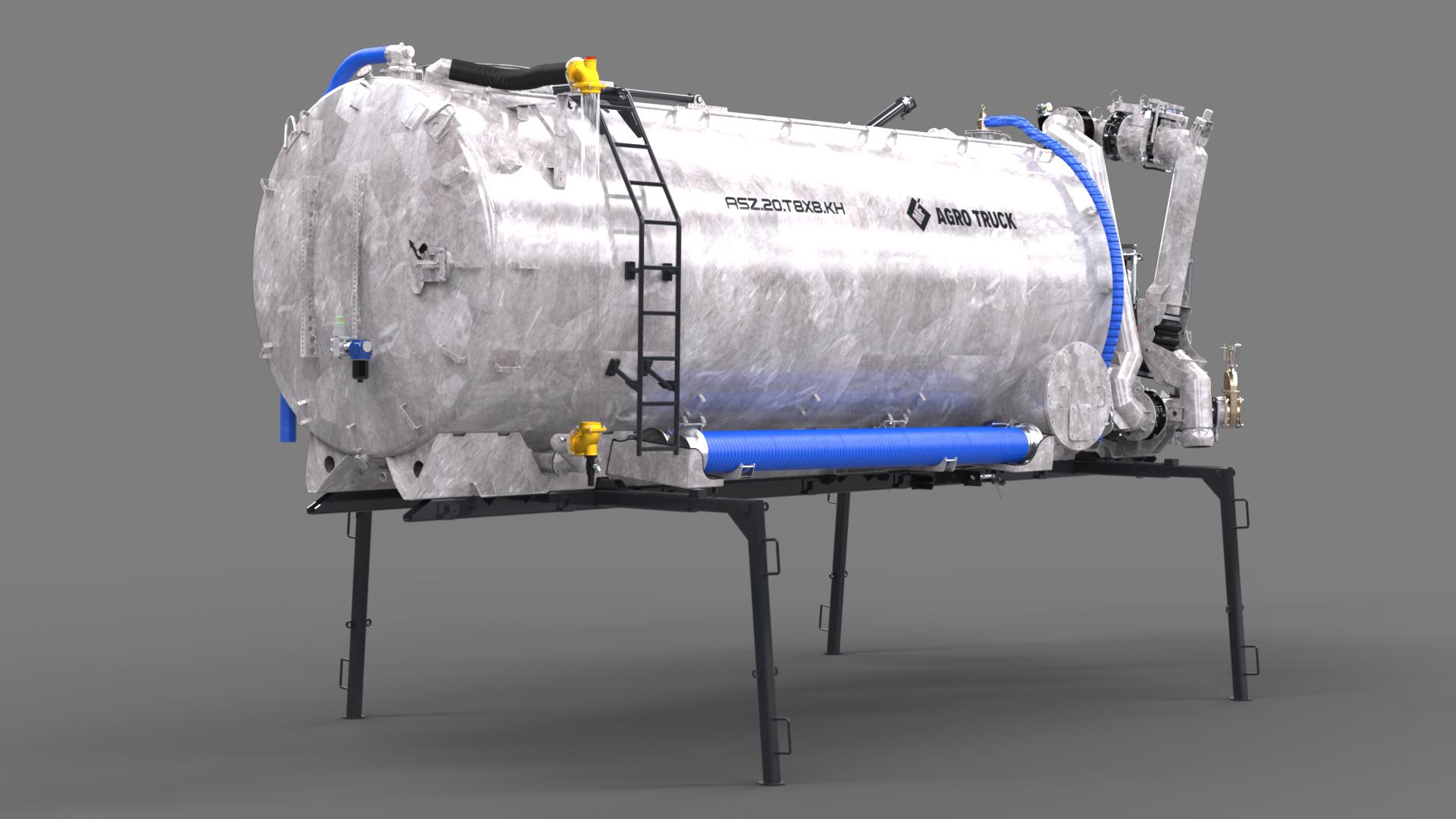 - asenizacyjną z cynkowanym zbiornikiem o poj. 20 tys. l, ramieniem ssąco-tłoczącym, pompą Vogelsang o wydatku 4,4 tys. l/min i sterowaniem automatycznym;