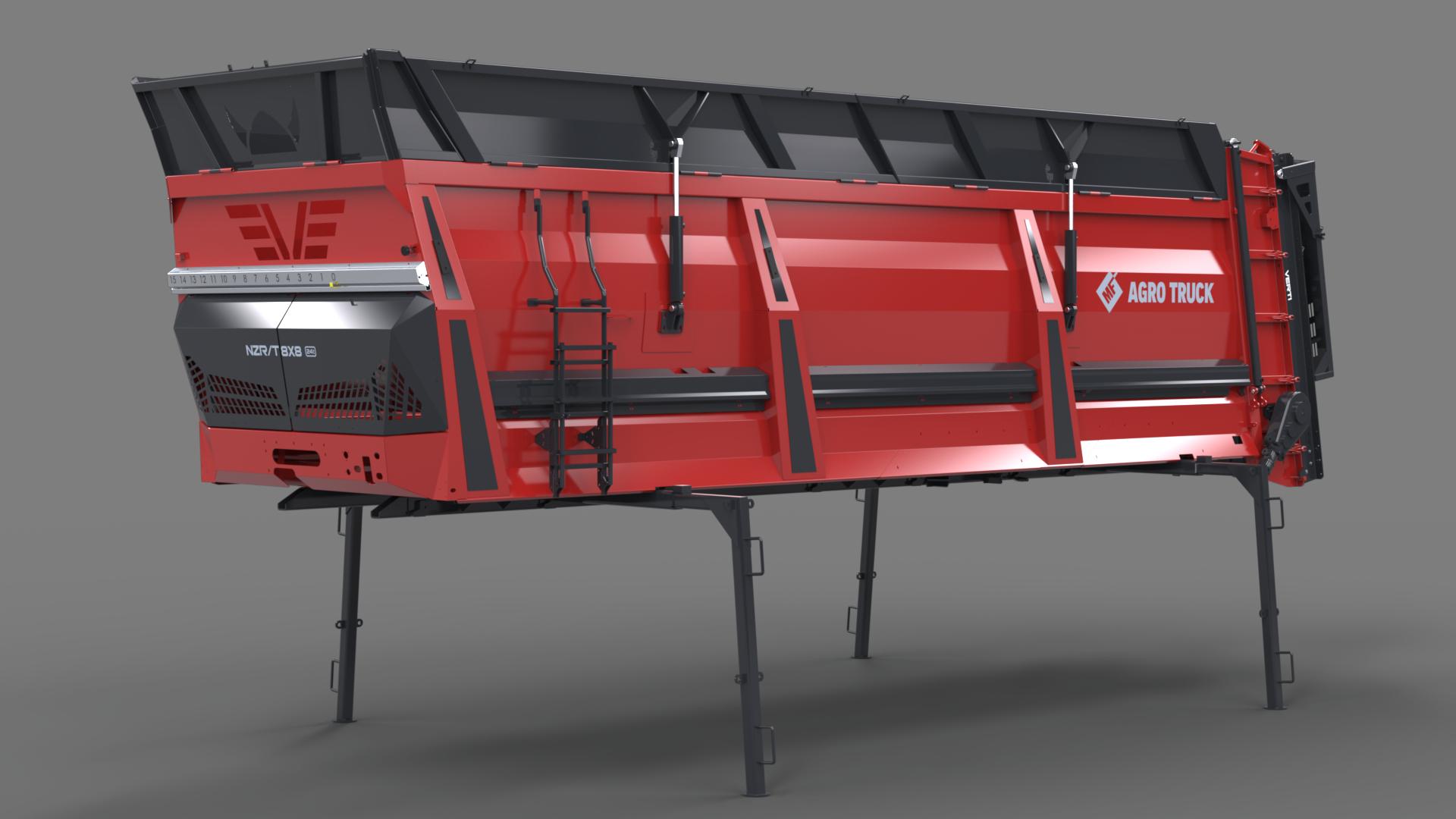 - rozrzucającą obornik o ładowności 24 t, z hydraulicznie unoszonymi nadstawkami, przenośnikiem podłogowym łańcuchowo-listwowym i hydraulicznie podnoszoną ścianą tylną ze wskaźnikiem otwarcia oraz pionowym adapterem rozrzucającym;