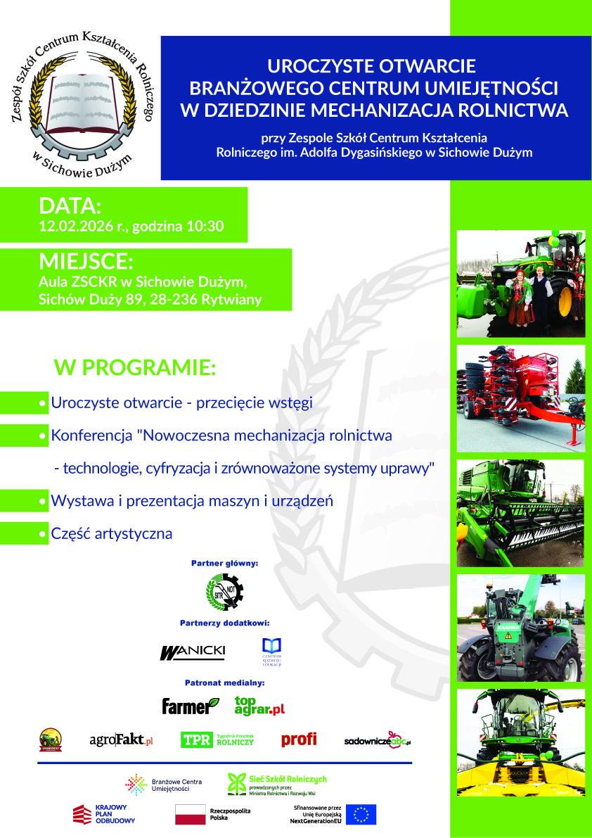 Zespół Szkół Kształcenia Rolniczego w Sichowie Dużym zaprasza na uroczyste otwarcie Branżowego Centrum Umiejętności w Dziedzinie Mechanizacja Rolnictwa przy Zespole Szkół Centrum Kształcenia Rolniczego im. Adolfa Dygasińskiego w Sichowie Dużym. Uroczystość została zaplanowana na 12 lutego 2026 r. o godz. 10.30 w Auli ZSCKR w Sichowie Dużym (dokładny adres to: Sichów Duży 89, 28-236 Rytwiany).