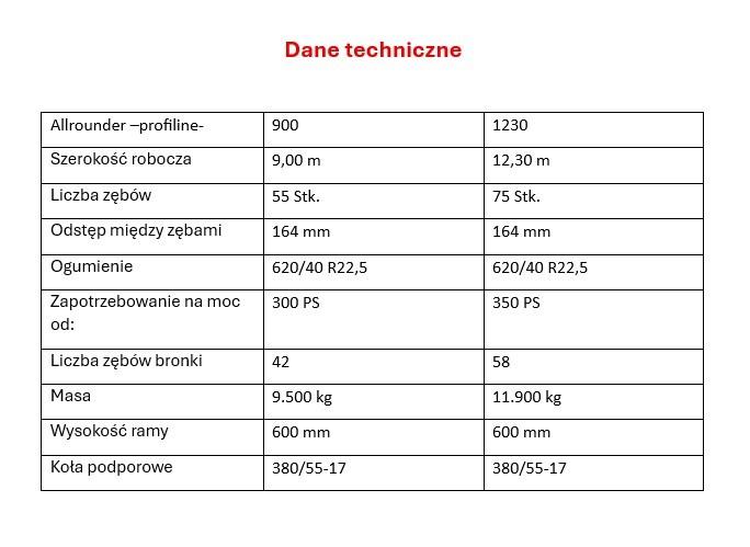 Köckerling Allrounder -profiline- 1230 oferowany będzie w dwóch szerokościach roboczych 9 i 12 m. W mniejszej wersji agregat ma 55 zębów, a jego masa sięga 9,5 t. W obu wariantach maszyna wyposażona jest w szerokie ogumienie 620/40 R22,5 i ma ramę o wysokości 600 mm.