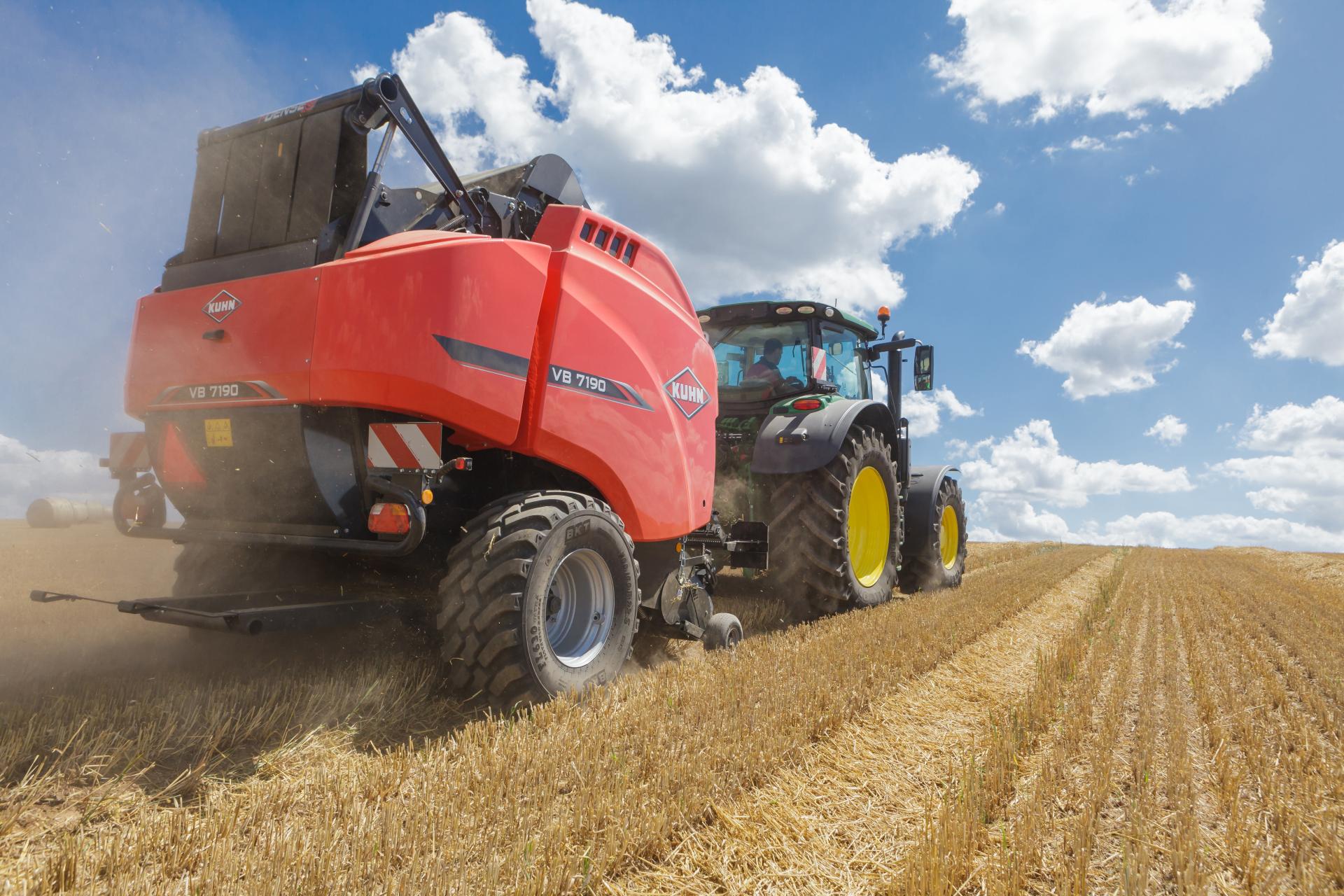 Prasa pasowa Kuhn VB 7190 z systemem TIM, czyli Tractor Implement Management formuje bele od 0,8 do 1,85 m. Jak informuje producent maszyna może się z pochwalić wysoką wydajnością i najwyższym stopniem zgniotu beli.