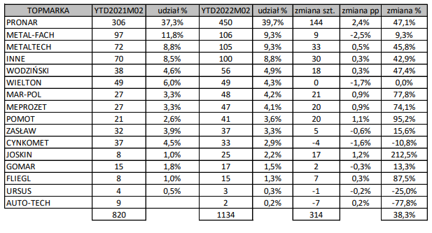 Pronar z liczbą 450 zarejestrowanych nowych przyczep jest liderem po dwóch pierwszych miesiącach 2022 roku. To aż o 144 szt. więcej niż rok wcześniej, kiedy to zarejestrowano 306 przyczep tej marki. Pronar, poprawia swoje udziały rynkowe w stosunku do zeszłego roku o 2,4 pp i obecnie posiada 39,7 % udziałów. Druga w zestawieniu jest marka Metal-Fach z 106 rejestracjami i udziałami 9,3%. Tylko o jedną sztukę wyprzedza trzecią w zestawieniu markę Metaltech, która również notuje 9,3% udziałów rynkowych. Marka Wodziński zajmuje czwarta pozycję – 56 szt. zarejestrowanych przyczep. Na kolejnych miejscach znajdują się Wielton - 49 szt., Mar-Pol – 48 szt. i Meprozet – 47 szt.