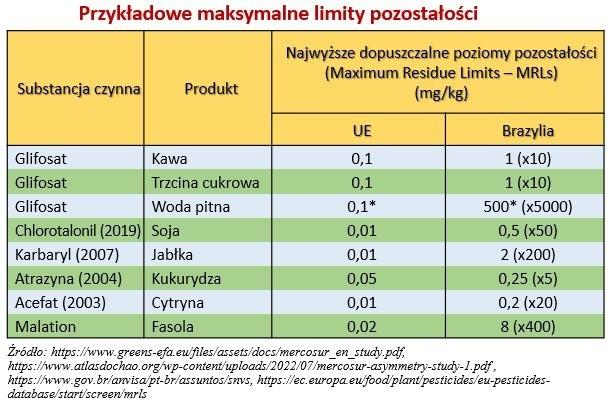 Zestawienie przykładowych MRL-i (Maximum Residue Limits) ujawnia gigantyczne różnice między Unią Europejską a Brazylią.
