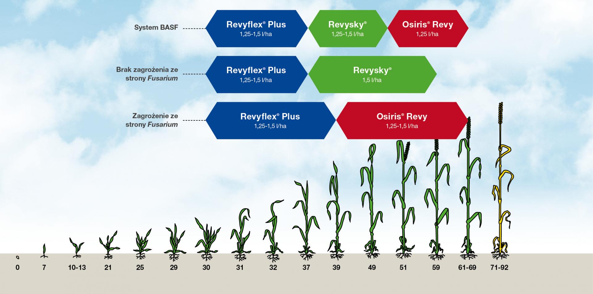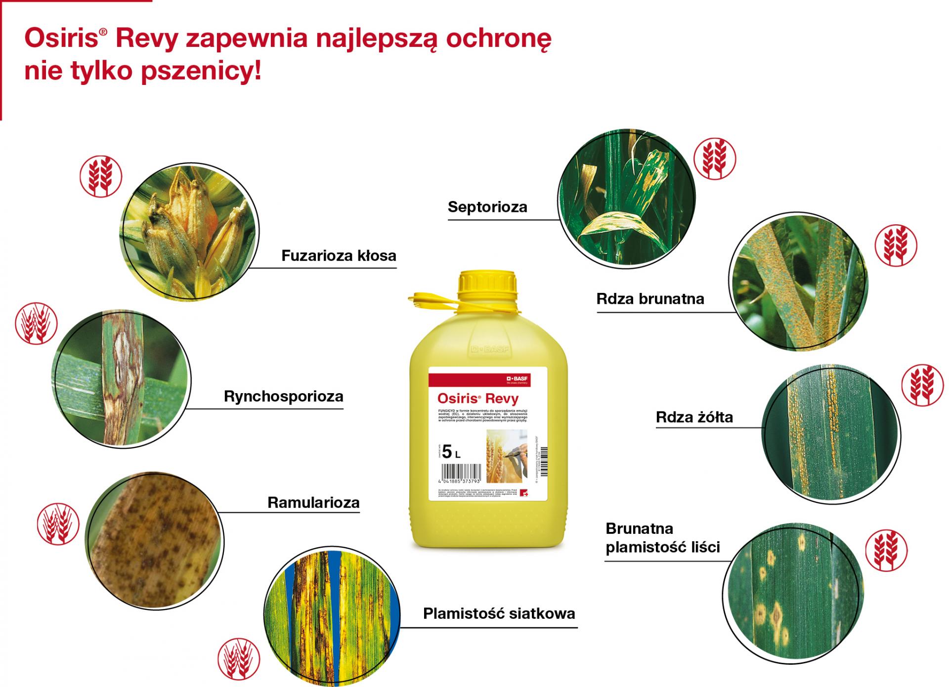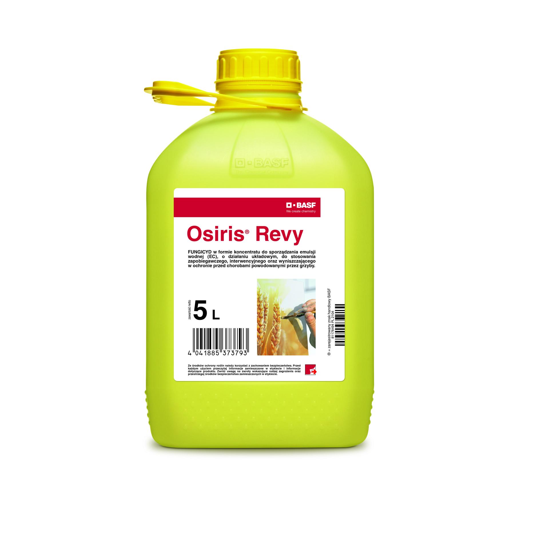 Osiris® Revy jest nowym produktem firmy BASF będącym kontynuacją portfolio fungicydów zawierających Revysol®, najlepszy triazol na rynku. Jest on dedykowany do ostatniego zabiegu w zbożach. Dzięki zaawansowanej formulacji substancje czynne w bardzo krótkim czasie wnikają do wnętrza rośliny, przez co szybko zwalczają istniejącą już infekcję. Z drugiej strony po oprysku ciecz robocza dosłownie otacza cały kłos – nawet w jego najmniejszych zakamarkach – oraz górne liście, zapewniając idealne pokrycie i dając gwarancję, że zastosowany produkt znalazł się w odpowiednim miejscu. Dodatkowo zaawansowana formulacja fungicydu Osiris® Revy sprawia, że jest on odporny na zmywanie przez deszcz (dzięki szybkiemu wchłanianiu) oraz na negatywne oddziaływanie promieniowania UV (powodującego rozrywanie wiązań chemicznych substancji czynnych i obniżającego ich skuteczność).