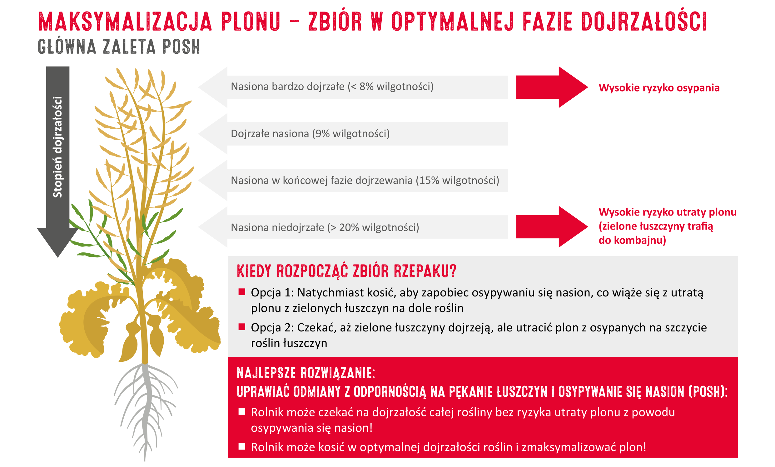 Zbiór w pełni dojrzałego łanu oznacza pełniejsze wypełnienie nasion i wyższy plon. Bez POSH często zachodzi konieczność wcześniejszego koszenia, by ograniczyć straty – kosztem nie w pełni dojrzałych łuszczyn z dolnych partii rośliny.