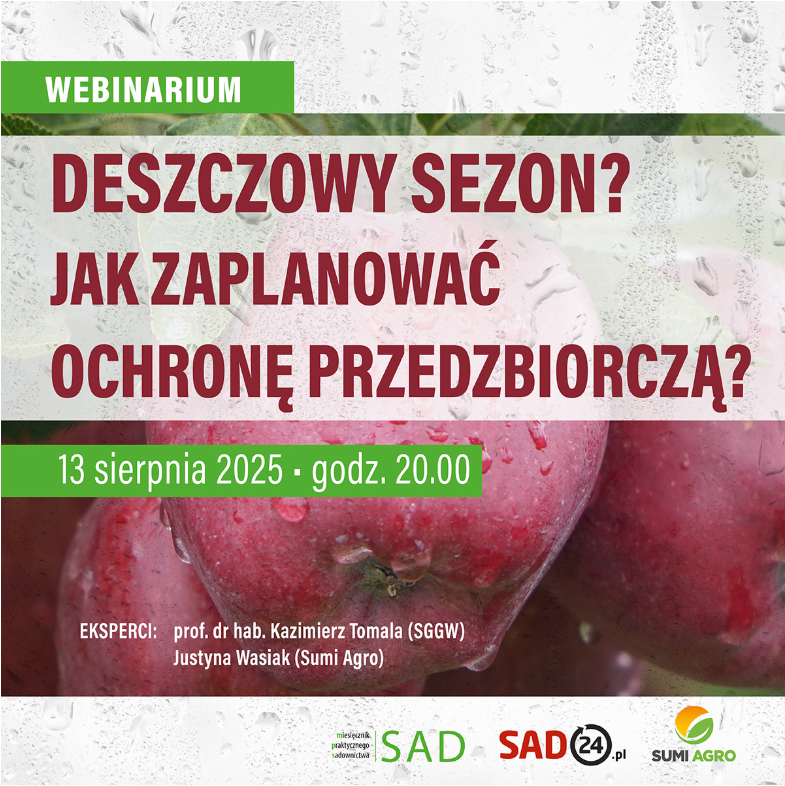 Jeśli planujemy przechowywać owoce, konieczne jest zaplanowanie odpowiedniej strategii ochrony przedzbiorczej, uwzględniającej warunki, z jakimi mieliśmy do czynienia. Czego możemy się spodziewać już w komorach przechowalniczych? Jak zabezpieczyć jabłka nie wprowadzając dodatkowych pozostałości? Już 13 sierpnia o godz. 20.00 na spotkaniu online opowiedzą o tym eksperci: prof. dr hab. Kazimierz Tomala (SGGW) oraz Justyna Wasiak (Sumi Agro – partner wydarzenia).