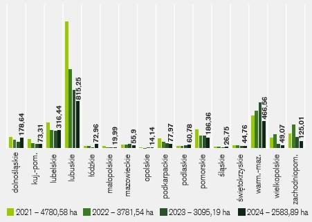 Jeszcze w latach 70. XX wieku w Polsce uprawiano 130 tys. ha lnu. Natomiast z danych Agencji Restrukturyzacji i Modernizacji Rolnictwa wynika, że areał pod tą rośliną w 2024 roku wynosił 2583,89 ha (patrz wykres). Zdecydowanym liderem w uprawie jest woj. lubelskie – 815,25 ha, ale też woj. warmińsko-mazurskie z 466,56 ha. Lubelszczyzna w 2021 roku mogła poszczyć się aż 2196,45 ha, czyli niewiele mniej niż całkowita powierzchnia pod lnem w ubiegłym roku. Co ważne, dane agencyjne nie wyróżniają areału zajętego przez len oleisty i włóknisty. Wiemy natomiast, że lnu włóknistego jest zdecydowanie mniej i zajmuje w kraju raptem kilkaset hektarów.
