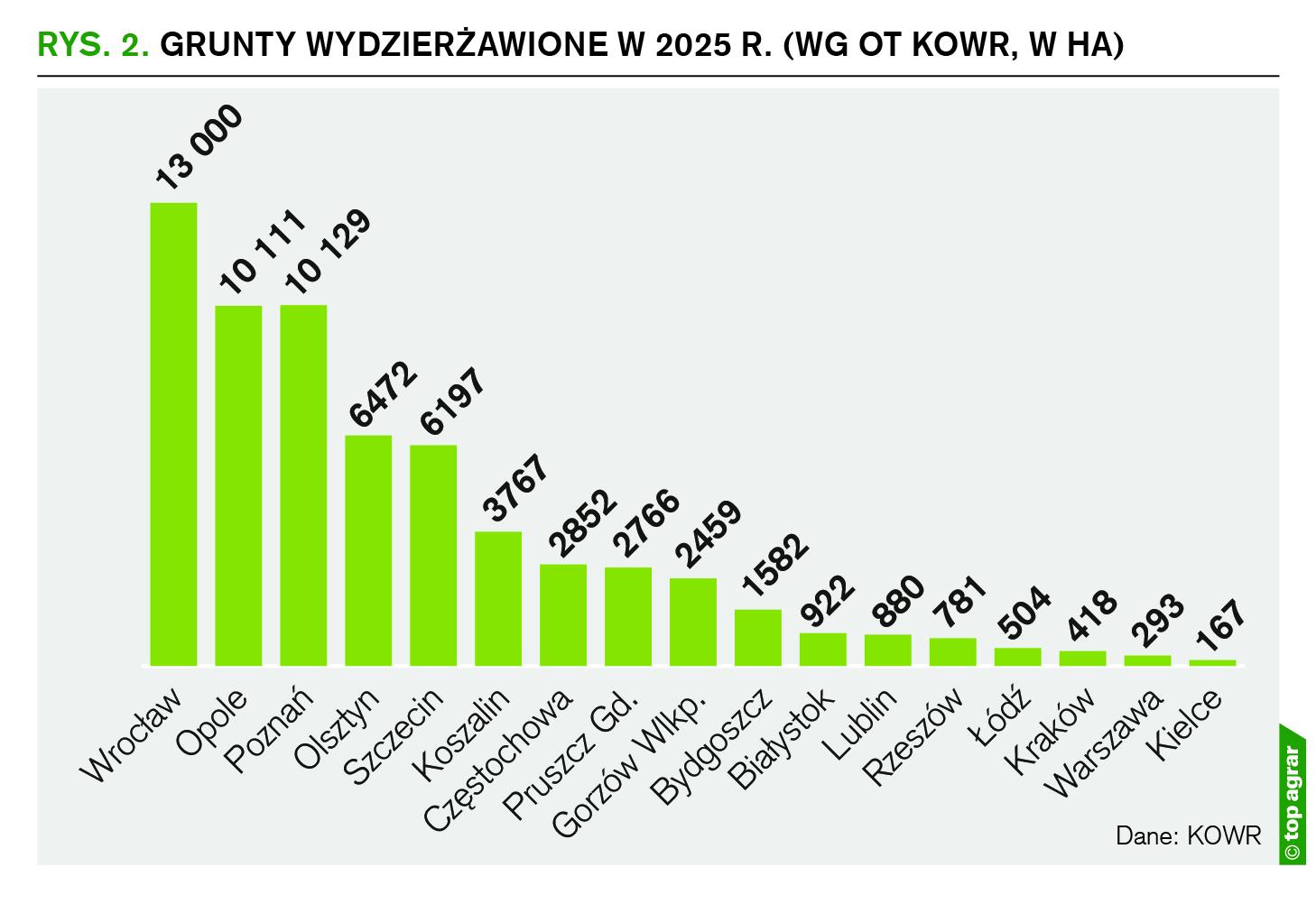 W samym natomiast 2025 roku KOWR na podstawie niemal 3,5 tys. zawartych umów wydzierżawił 63,3 tys. ha ziemi. To o 31,9% więcej niż w 2024 (43,1 tys. ha) i aż o 59,1% w porównaniu z 2023 rokiem (25,9 tys. ha). Najwięcej gruntów wydzierżawiły OT KOWR we Wrocławiu (13 tys. ha), Opolu (10 111 ha) i Poznaniu (10 129 ha) (patrz rys. 2.). Najmniej natomiast oddziały w Krakowie (418 ha), Warszawie (293 ha) i Kielcach (167 ha). Tymczasem tylko grudniu KOWR wydzierżawił 9174 ha, z czego najwięcej OT w Poznaniu – 3625. W Kielcach za to ani jeden hektar nie trafił w ręce rolników.