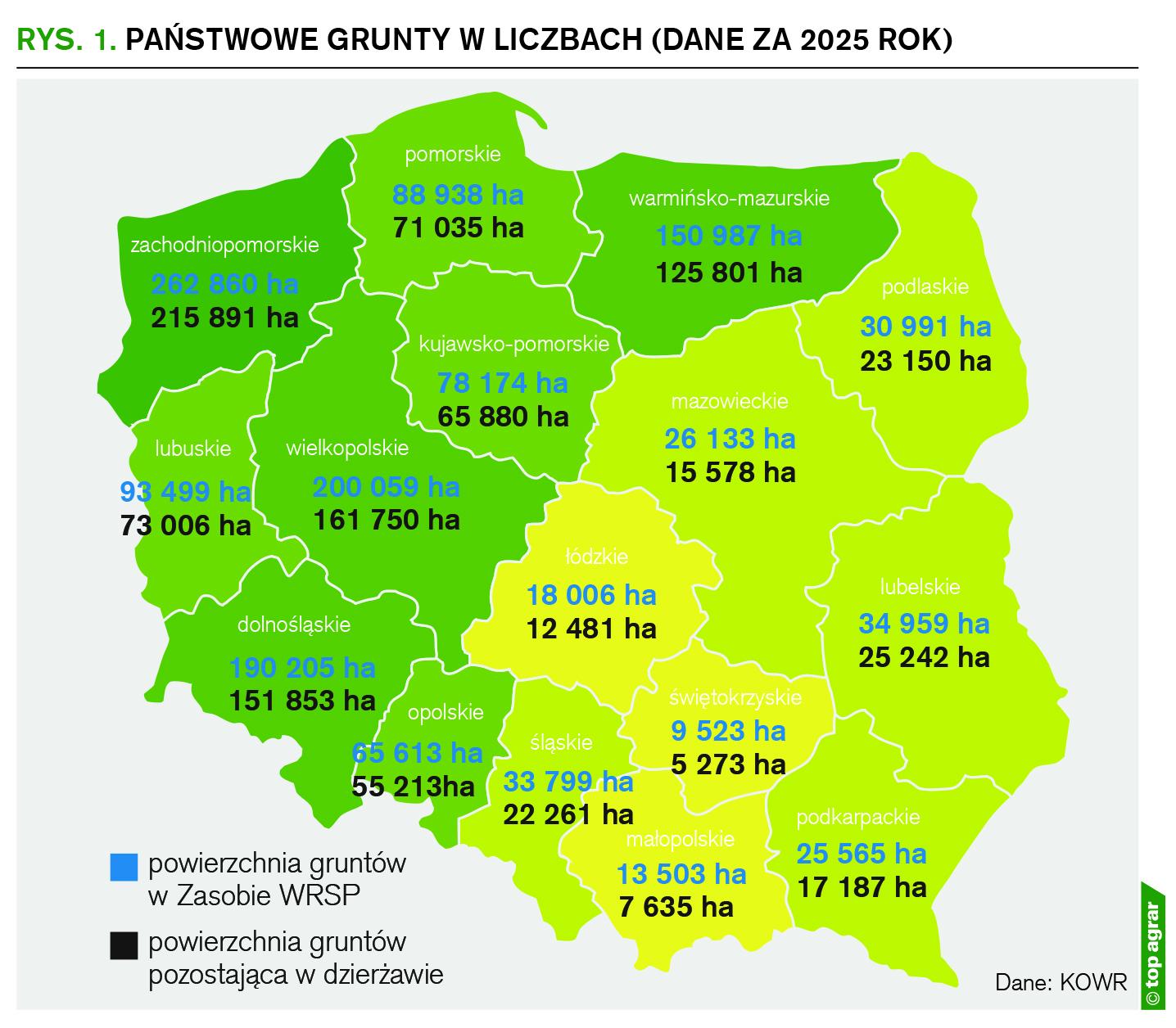 Od początku swojej działalności Krajowy Ośrodek Wsparcia Rolnictwa (KOWR, dawniej Agencja Nieruchomości Rolnych, a jeszcze wcześniej Agencja Właśności Rolnej Skarbu Państwa) władał w sumie 4,7 mln ha. Tak wynika z danych KOWR za 2025 rok. Tym samym na koniec ubiegłego roku w Zasobie Własności Rolnej Skarbu Państwa (WRSP) znajdowało się 1,32 mln hektarów ziemi. Największe połacie rozpościerały się na zachodzie kraju: w woj. zachodniopomorskim (262,9 tys. ha), wielkopolskim (200,1 tys. ha) i dolnośląskim (190,2 tys. ha) (patrz rys. 1.). Nic zatem dziwnego, że również w tych województwach najwięcej gruntów znajdowało się w dzierżawie, odpowiednio: 215,9, 161,8 i 151,9 tys. ha.