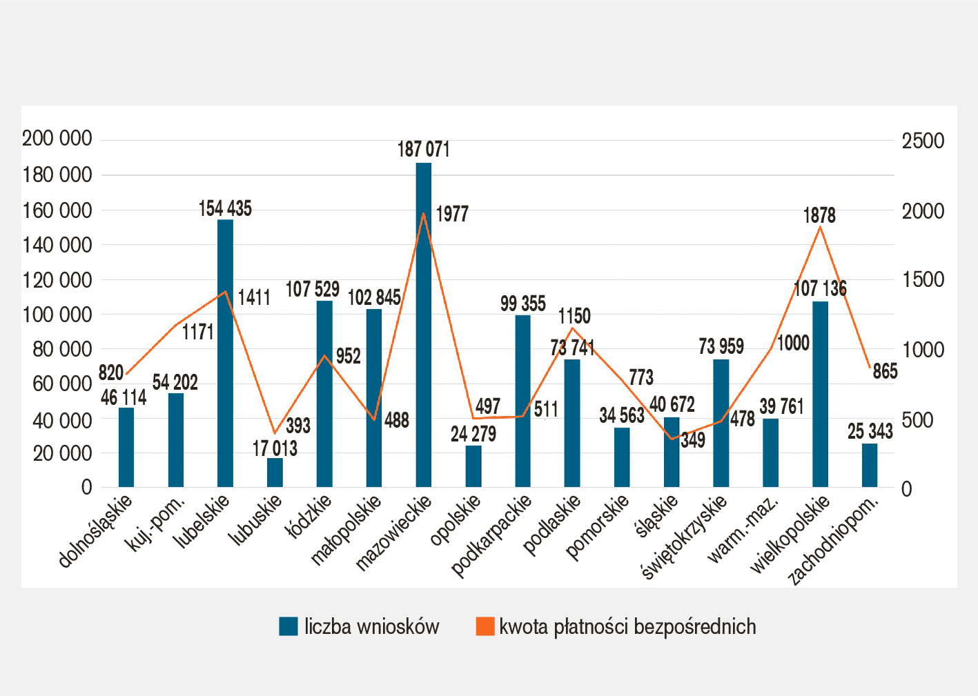Łącznie w tych czterech regionach działa aż 46% wszystkich rolników korzystających z dopłat.