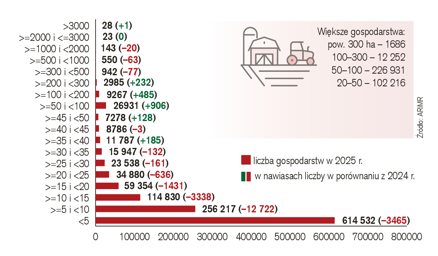 Polskie rolnictwo wciąż charakteryzuje się dużym rozdrobnieniem. Z danych Agencja Restrukturyzacji i Modernizacji Rolnictwa (ARiMR) za 2025 rok wynika, że aż 614,5 tys. gospodarstw ubiegało się o dopłaty w grupie do 5 ha. Kolejne 256,2 tys. mieściło się w przedziale 5–10 ha, a 114,8 tys. – 10–15 ha.