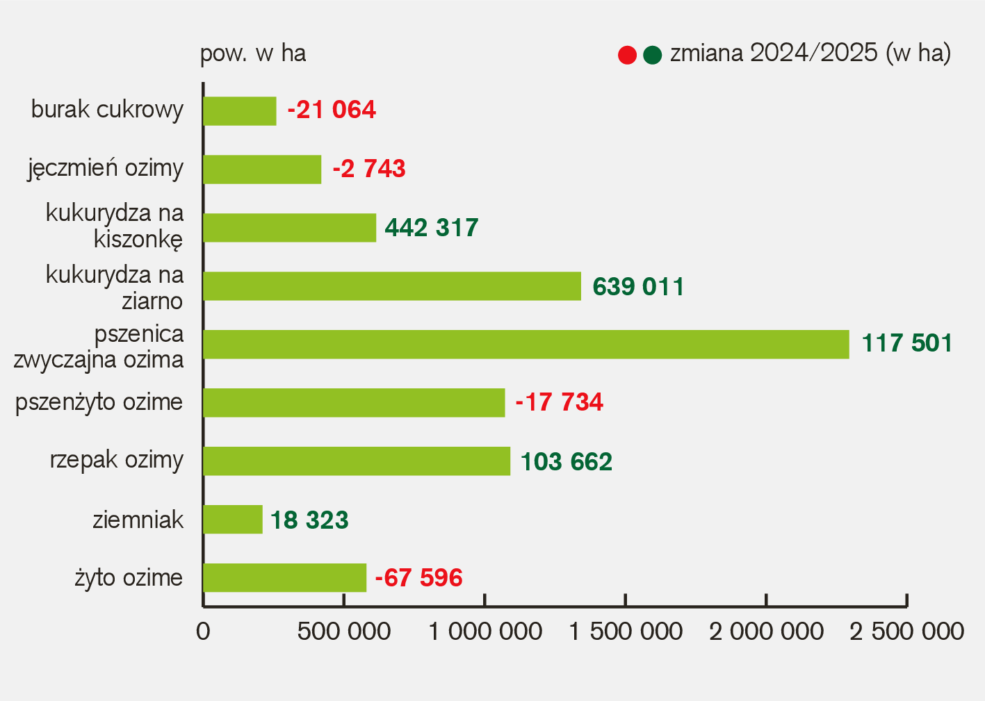 W strukturze zasiewów nadal dominują tradycyjne uprawy. Największe powierzchnie zajmują: pszenica ozima – 2,29 mln ha, kukurydza na ziarno – 1,34 mln ha oraz rzepak ozimy – 1,09 mln ha. Wszystkie te uprawy odnotowały wzrost powierzchni rok do roku.