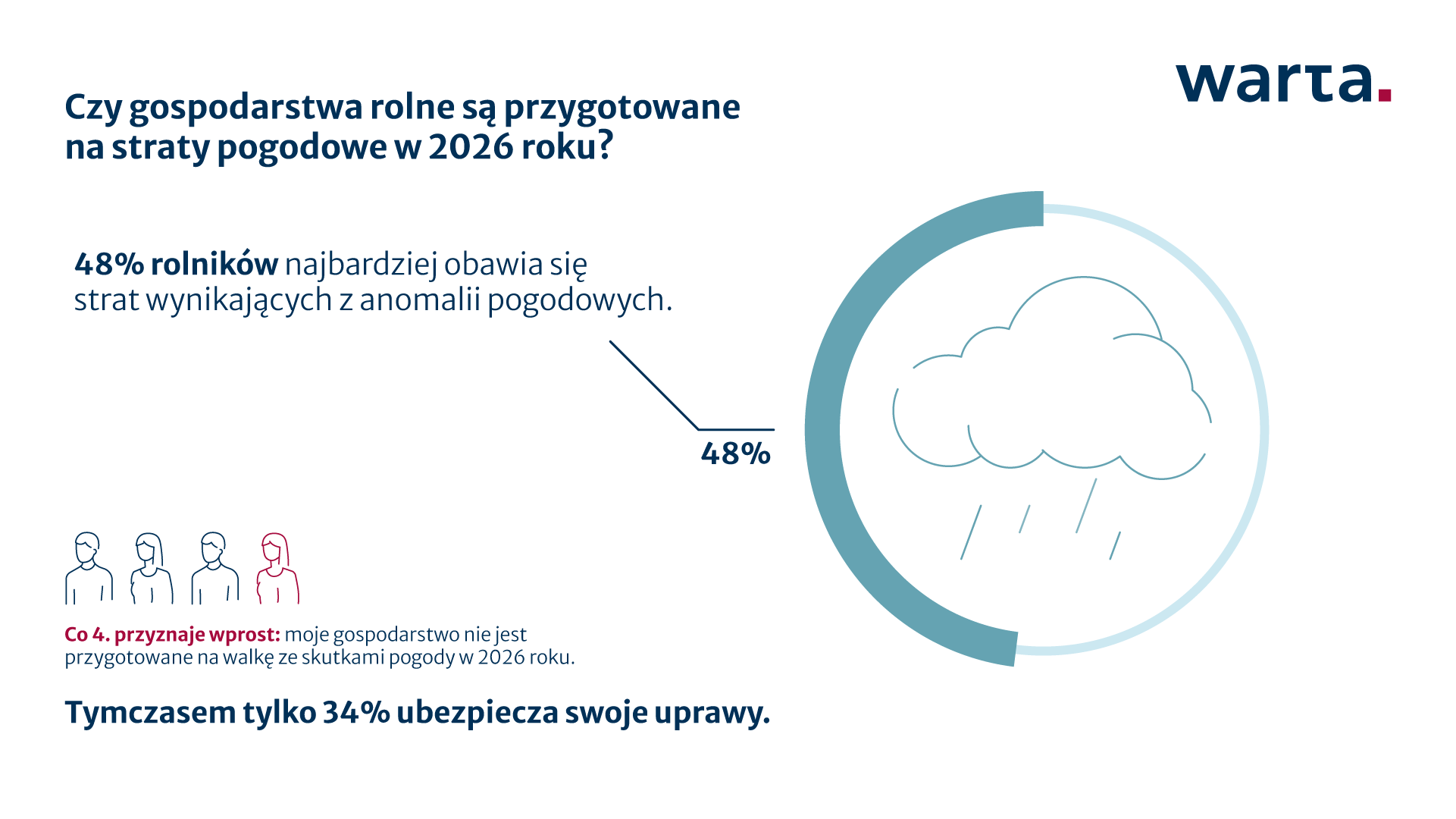 Anomalie pogodowe stały się największym wyzwaniem dla polskich rolników — tak wynika z najnowszego badania przeprowadzonego przez Fieldstat na zlecenie Warty. Połowa badanych wskazuje je jako swoje główne zmartwienie przed nadchodzącym sezonem. Jednocześnie poziom zabezpieczeń pozostaje niski, a co czwarty rolnik przyznaje, że nie jest przygotowany do radzenia sobie ze stratami pogodowymi w 2026 roku.