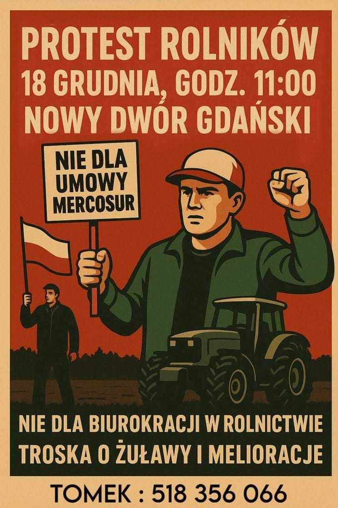 Rolnicy z okolic Nowego Dworu Gdańskiego zapowiadają protest, który odbędzie się 18 grudnia o godzinie 11:00. Demonstracja będzie miała charakter pokojowy, bez blokowania miasta, ale jej organizatorzy chcą wyraźnie pokazać swój sprzeciw wobec polityki rolnej i handlowej UE i polskiego rządu. Spodziewają się od kilku do nawet stu ciągników.