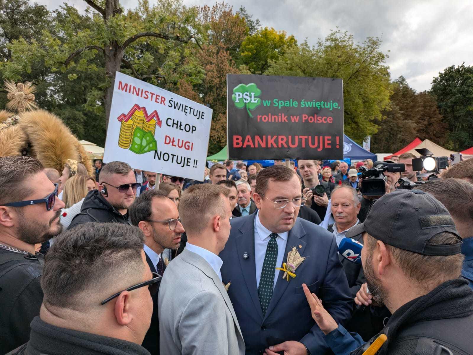 Na transparentach nie brakowało mocnych haseł: „PSL w Spale świętuje, polski rolnik bankrutuje” i „Minister świętuje, chłop długi notuje”.