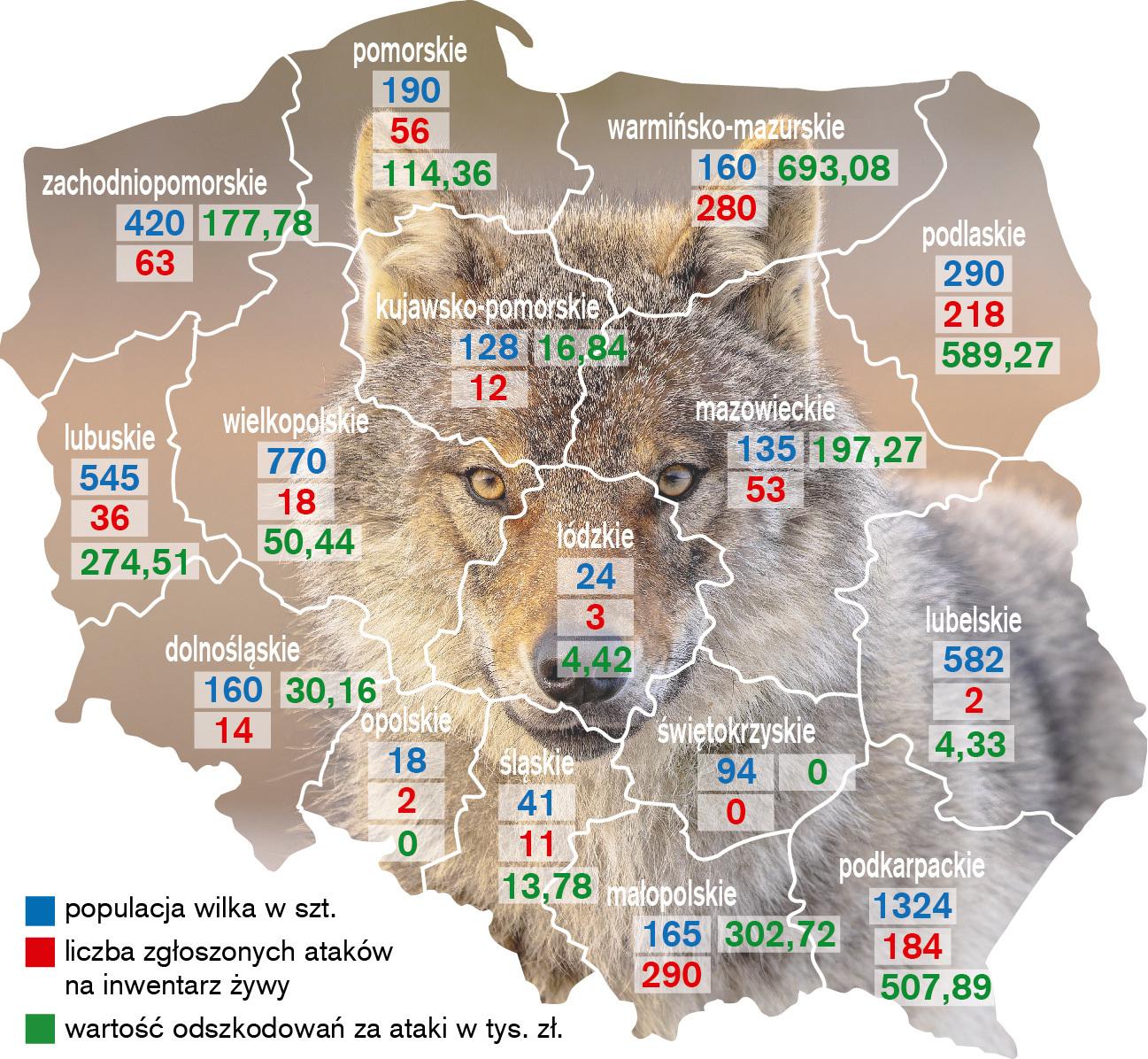 Szacuje się, że na koniec 2023 r. w Polsce żyło 5046 wilków, podczas gdy w 2014 r. jego populacja wynosiła 1276 osobników. 1/5 tych drapieżników bytuje w woj. podkarpackim (patrz mapka). W całej Unii Europejskiej natomiast jest ich niecałe 20 tys.
