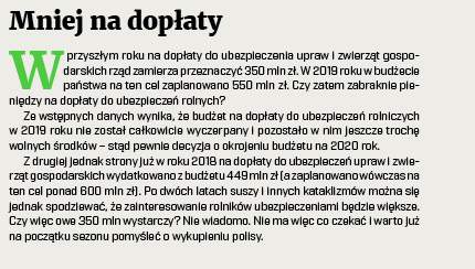 Dotyczy to nie tylko rządowej pomocy do hektara – takiej, jaką ARiMR wypłacała w 2018 i 2019 roku w związku z suszą, ale także dostępu do kredytów klęskowych z obniżonym oprocentowaniem. Nie ma żadnej gwarancji, że w 2020 roku nie będzie żadnych kataklizmów. Aktualnie ci, którzy ubezpieczyli przynajmniej połowę upraw, mogą zaciągnąć kredyt klęskowy z oprocentowaniem 0,5%, a nieubezpieczeni – w zależności od banku – od 2,08 do 2,86%. To duża różnica.