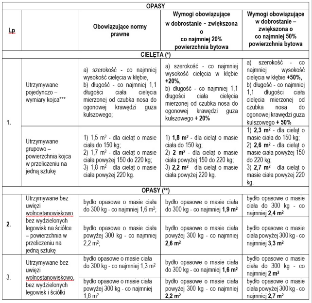 - Zwiększona powierzchnia bytowa – zwierzętom objętym wymogami zapewnia się zwiększoną o co najmniej 20% lub o co najmniej 50% powierzchnię bytową w pomieszczeniach/budynkach, zgodnie z PL 473 PL tabelą określającą minimalne wielkości tych powierzchni: