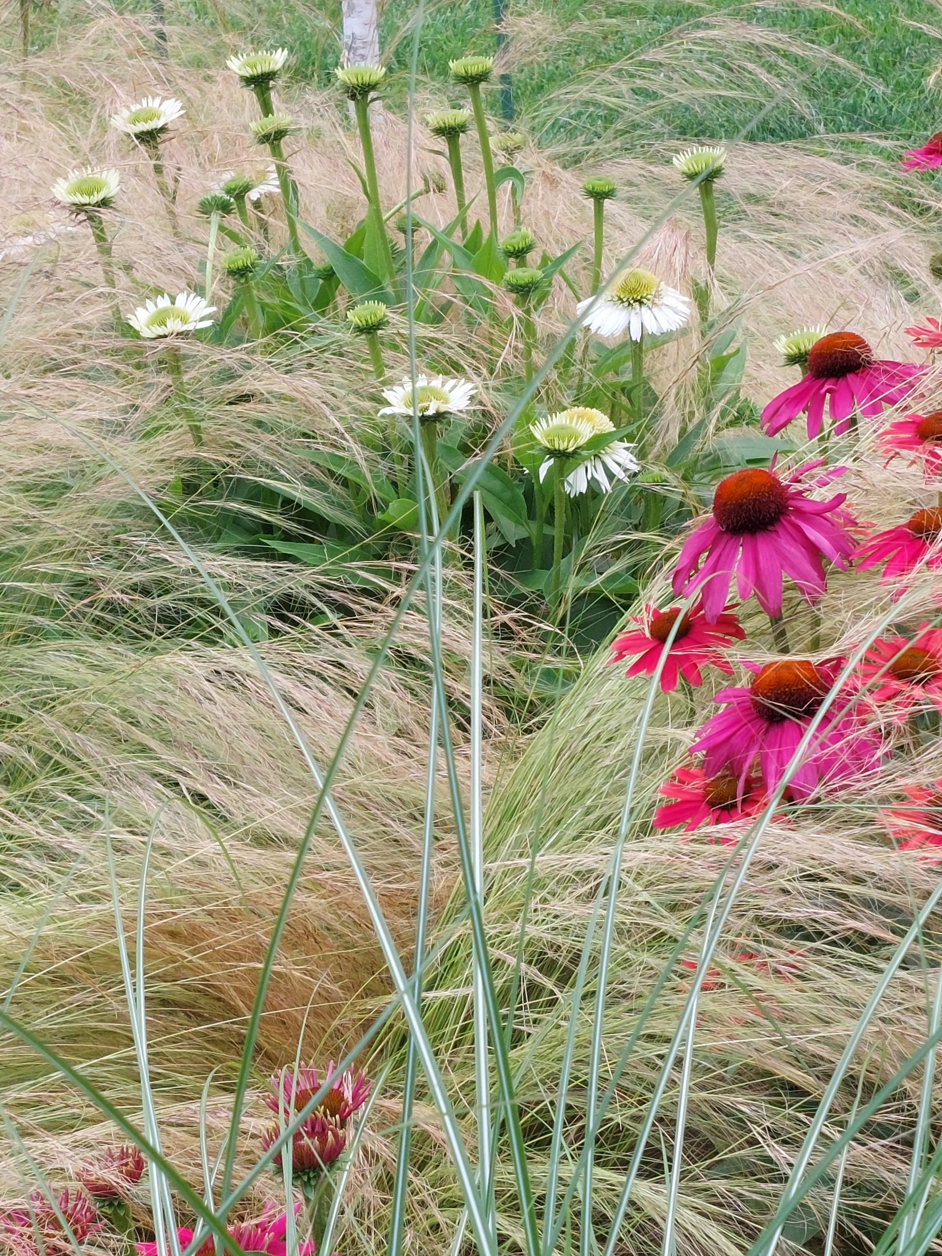 Ostnica piórkowata (użyta do stworzenia powyższego bukietu ślubnego) w ogrodzie z jeżówkami.