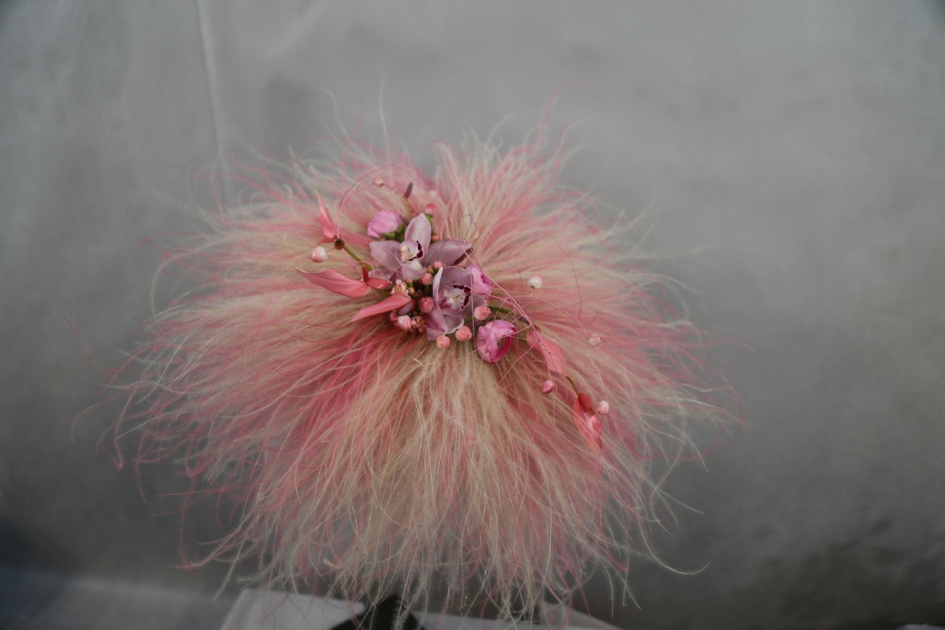 Niespotykany bukiet ślubny. Propozycja Mai Wacław, w której bazą jest barwiona zwiewna trawa ostnica piórkowata. Na szczycie różowe anturium, cymbidium, róża i pełnik, owoce dziurawca barwierskiego oraz różowe, delikatne pędy asparagusa pierzastego pozbawione igiełkowatych liści.