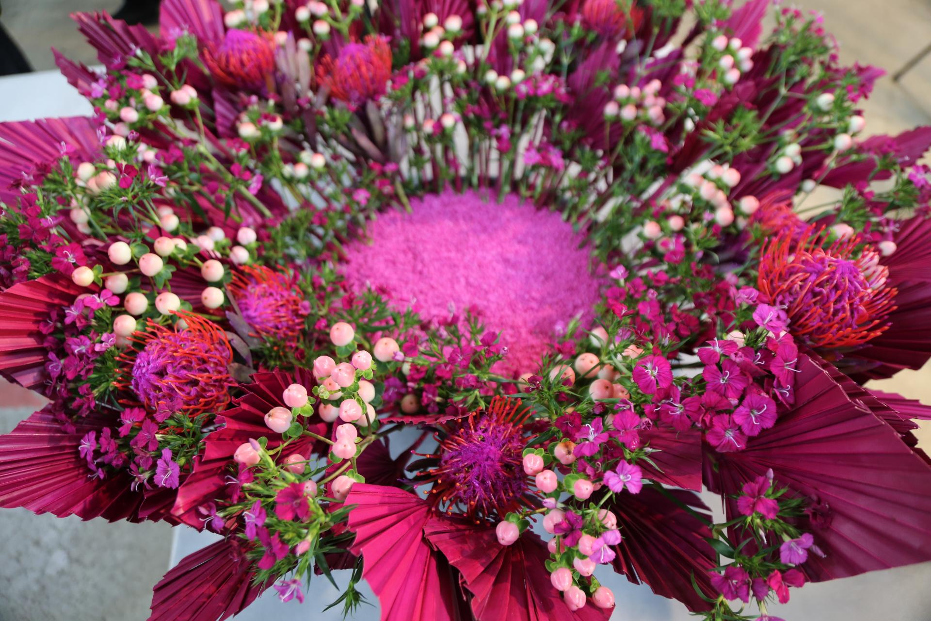 Amarantowa barwiona aranżacja w misie na bazie wachlarzowatego suszu palmy waszyngtonii. Powtarzalnym elementem są suszone kwiatostany leucospermum oraz żywe goździka brodatego i biało-różowe owoce dziurawca barwierskiego. W centrum piasek zabarwiony na różowo. Autor – Zygmunt Sieradzan.