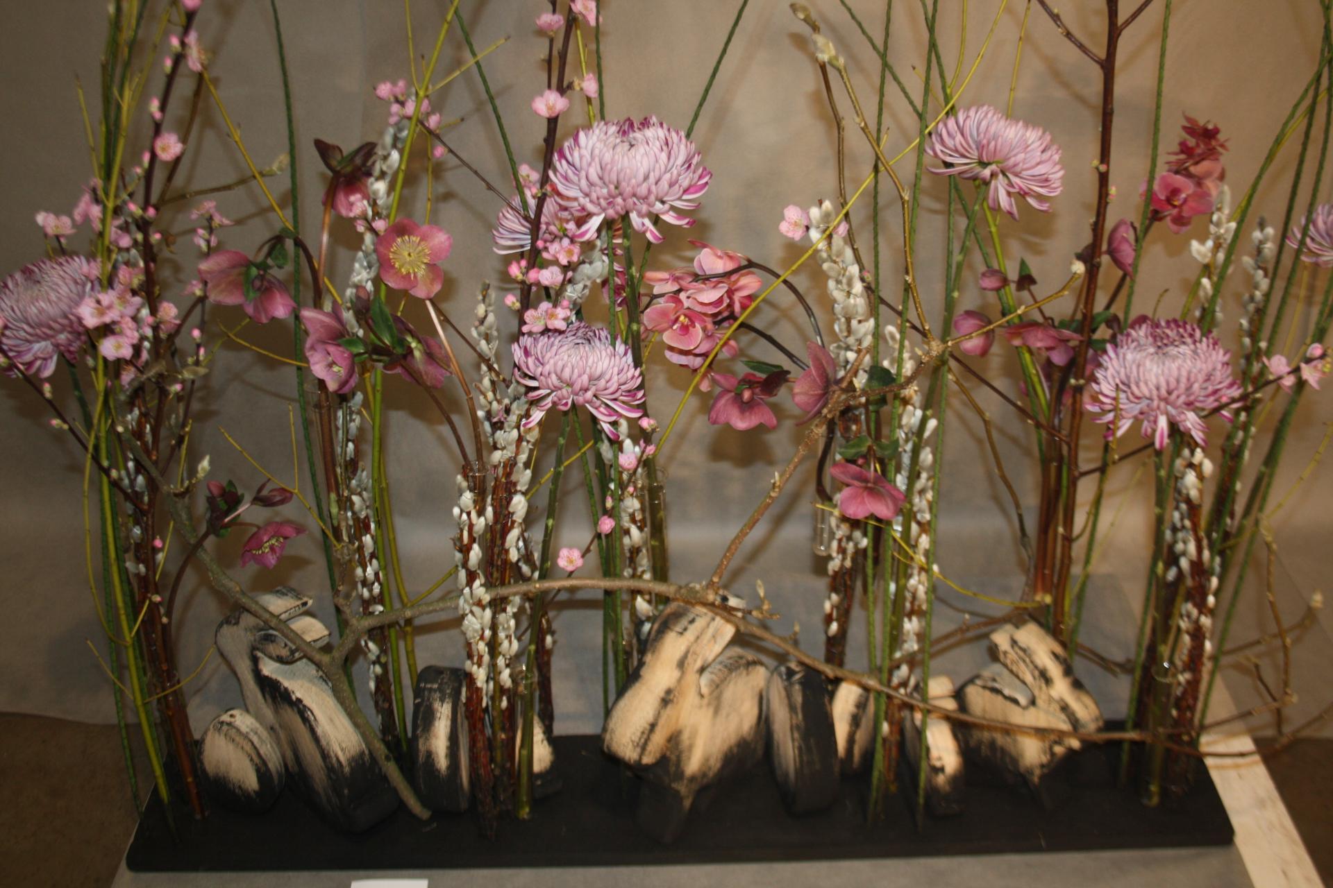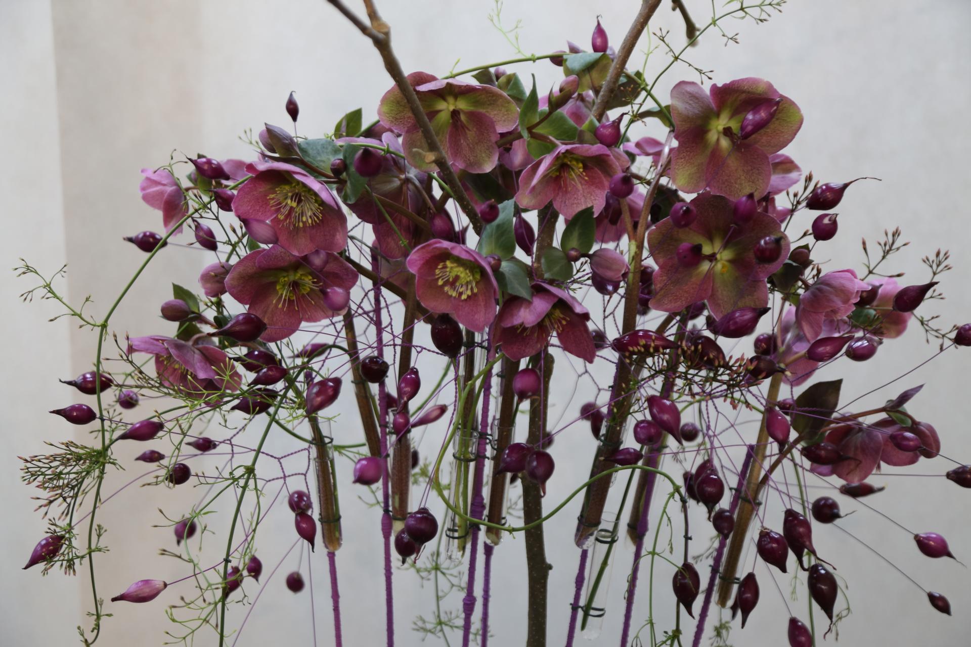 Rożowo-fioletowa kompozycja Zygmunta Sieradzana. W roli głównej ciemierniki (umieszczone w fiolkach z wodą) i zaskakujące we florystyce fioletowe cebule dymki (obrane z zewnętrznej suchej łuski). W centrum gałąź magnolii. Lekkości nadają zestawieniu pędy jaśminu kwiecistego.