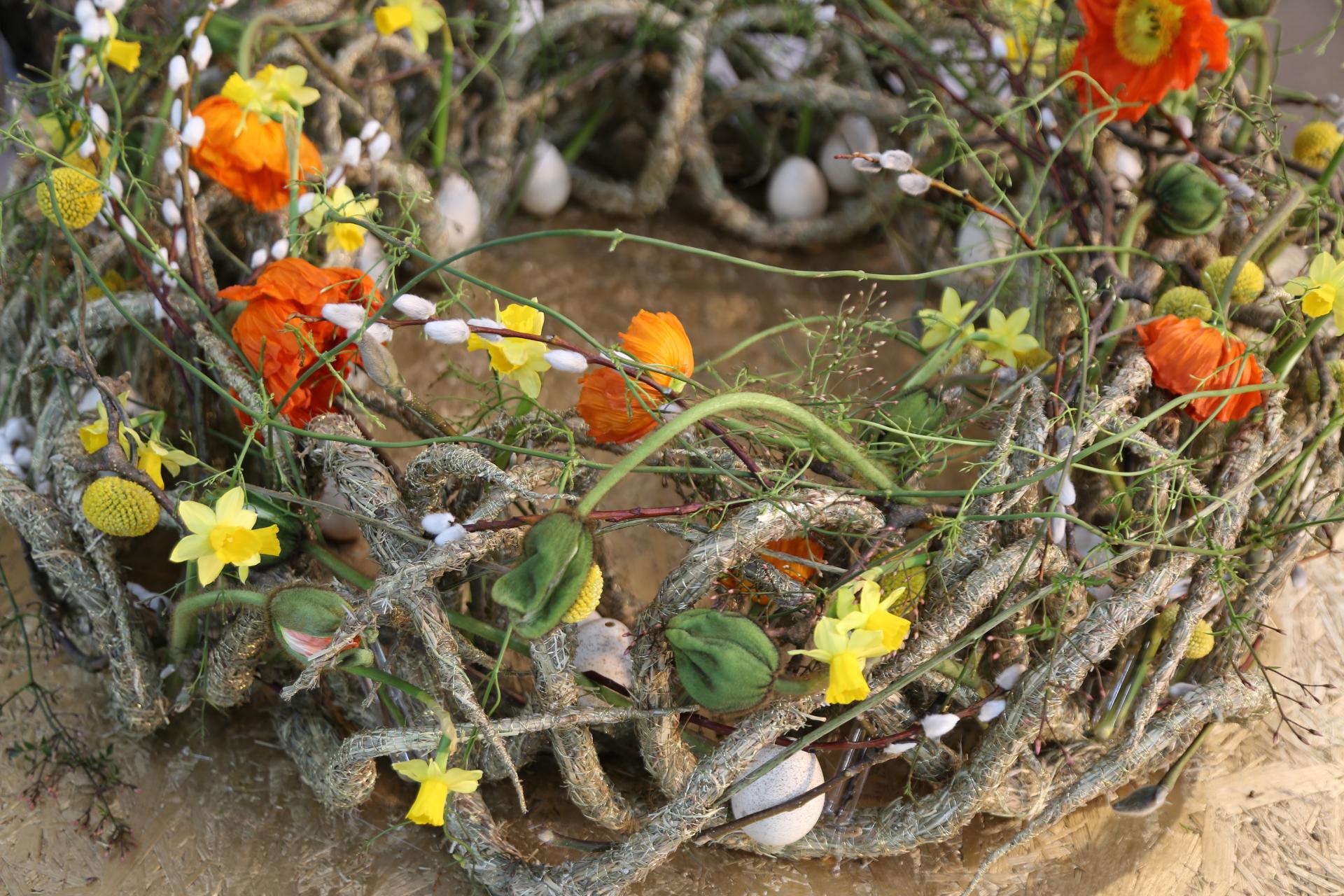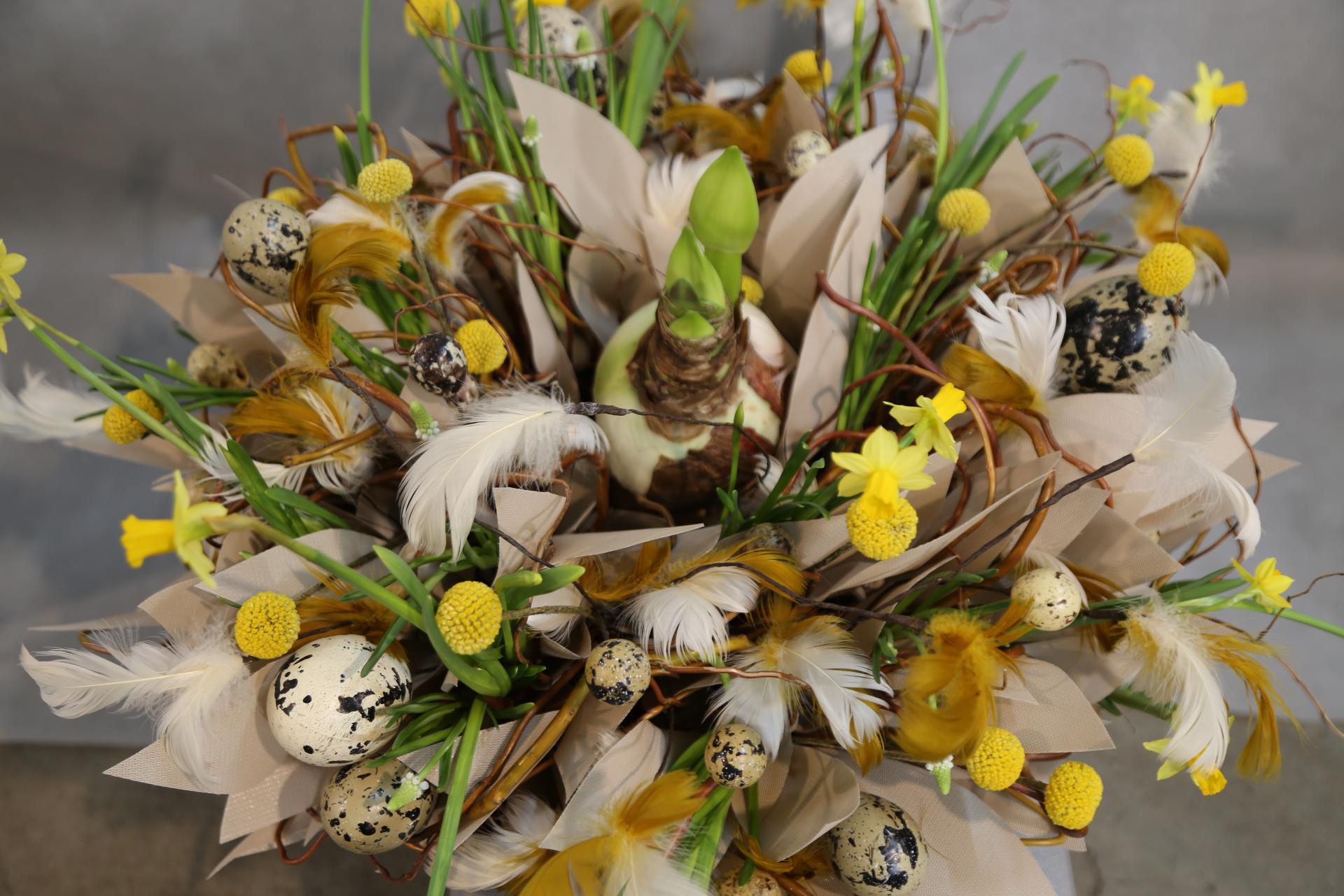 Wielkanocna propozycja Mai Wacław z wykorzystaniem beżowej folii piankowej w kształcie liści. Punktem centralnym jest cebula zwartnicy (Hippeastrum). Styropianowe jajeczka umocowano na drutach. Żółte akcenty – narcyzy drobnokwiatowe i kuliste kwiatostany kraspedii. Całości dopełniają dwukolorowe piórka i wijące się pędy wierzby mandżurskiej.