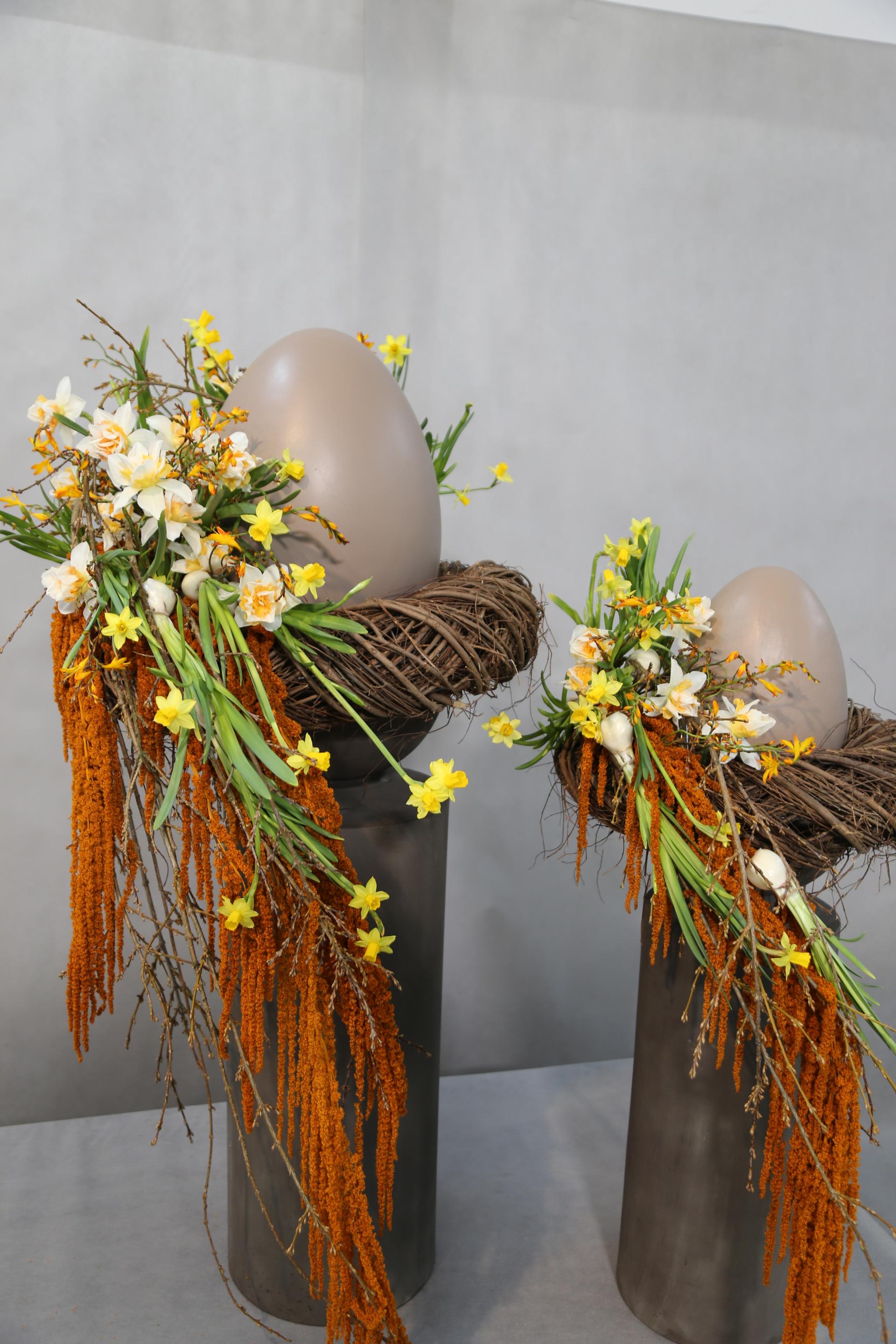 Jak Wielkanoc to jaja, te malutkie i olbrzymie. Jak w tej kompozycji. Pomarańczowe elementy to kwiatostany szarłatu wiechowatego. Kwiaty cebulowe – narcyzy mają woskowane cebule. Widzimy też kwiaty storczyka cymbidium oraz pomarańczowe kwiatostany krokosmii (cynobrówki) w szklanych fiolkach. Zdrewniałe pędy forsycji tuż przed rozwojem żółtych kwiatów. Autorka – Maja Wacław.