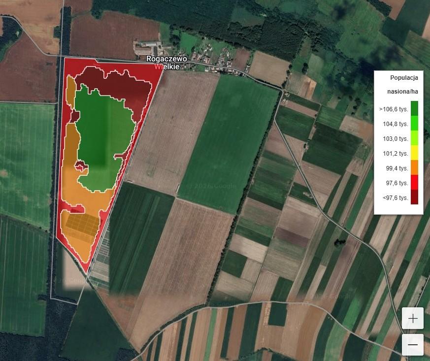 – Kukurydzę siejemy 8-rzędowym siewnikiem Väderstadt Tempo. Wcześniej przygotowujemy mapę zmiennego siewu na podstawie zmienności glebowej, analiz chemicznych gleby i zmapowanego wcześniej plonu. Wyznaczamy najczęściej 3–4 strefy na danym polu i przypisujemy im konkretną normę siewu. Aplikacja podpowiada zakres tych stref, ale można je zawsze edytować i łączyć na podstawie wasnej znajomości pola – mówi agronom. Gotową mapę otrzymuje operator ciągnika, a siewnik na podstawie sygnału GPS odczytuje w jakiej strefie się znajduje i dostosowuje normę siewu. Operator skupia się wtedy na technicznych parametrach siewu. Finalnie norma siewu wynosi 75–90 tys. ziaren/ha, a na najsłabszych fragmentach nawet 70 tys. ziaren/ha.