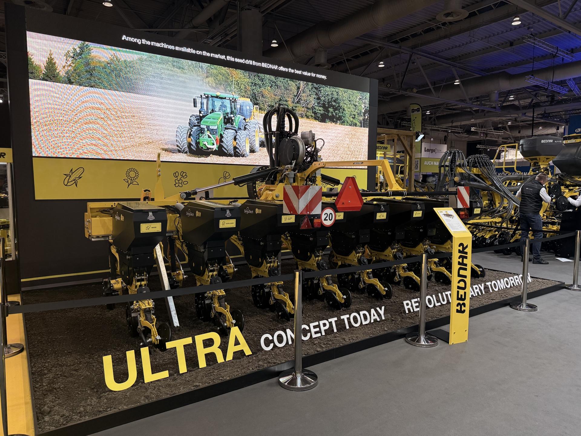 Siewnik Bednar Ultra UN to zupełnie nowa konstrukcja, opracowana przez czeskich inżynierów. Bednar postawił na nadciśnieniowy system pojedynkowania nasion, co ma zapewniać dokładne rozmieszczenie nasion w rzędzie nawet przy dużych prędkościach. Na ramie siewnika o szerokości 6 m może pracować od 8 do 15 sekcji w zależności od rozstawu, który można zmieniać w zakresie od 35 do 75 cm. Siewnikiem będzie można wysiewać m.in. soję, słonecznik, rzepak, buraki cukrowe, kukurydzę i sorgo. Zbiorniki nasion mają pojemność 100 l, a hydraulicznie regulowany docisk sekcji ma wynosić maksymalnie 350 kg. Koła zamykające bruzdę nasienną mogą być wyposażone w pneumatyczny, regulowany układ docisku. Bednar informuje, że przez najbliższe miesiące siewnik będzie intensywnie testowany. Dzięki zebranym doświadczeniom producent zamierza w 2027 roku zaprezentować gotową konstrukcję.
