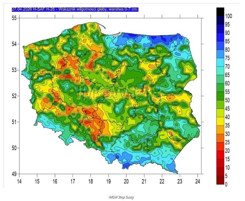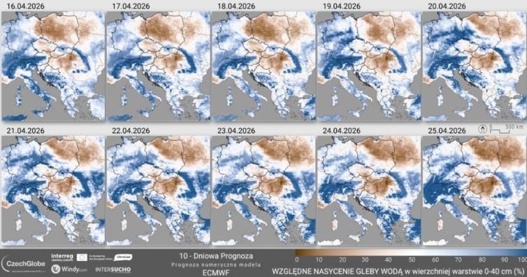Jak wskazuje analiza IUNG Puławy, susza glebowa dla krajów Europy Środkowo-Wschodniej wskazuje na znaczące deficyty wody w glebie, szczególnie w centralnej i zachodniej Polsce. Względne nasycenie gleby wodą może osiągnąć tam w najbliższym czasie poziom 10 % (kolor intensywnie –brązowy).