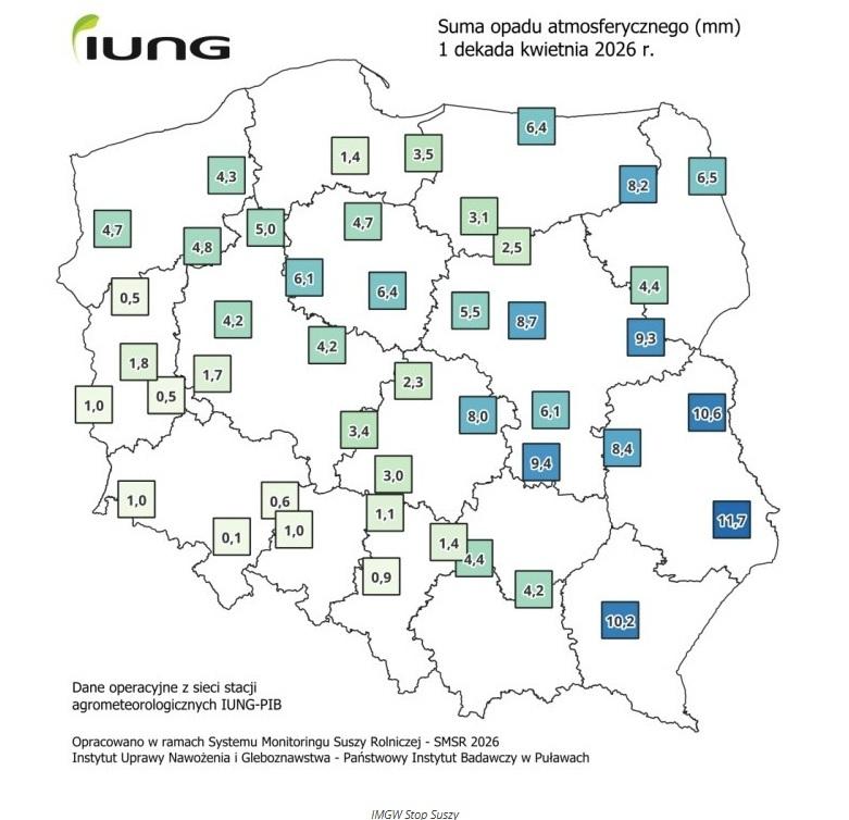- W pierwszej dekadzie kwietnia więcej deszczu notowano głównie we wschodniej i południowo-wschodniej części kraju, podczas gdy zachód i północ pozostawały wyraźnie suche.