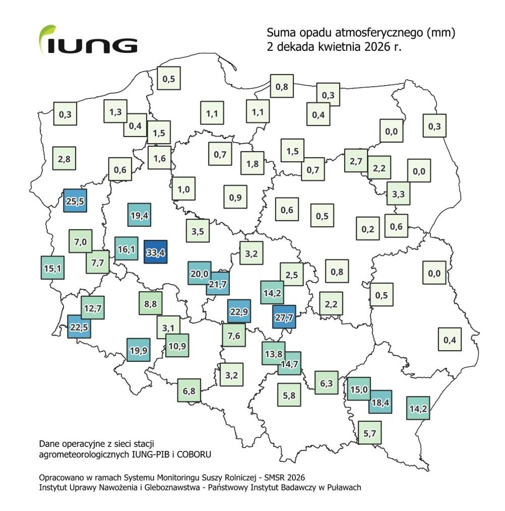 - W drugiej dekadzie sytuacja była jeszcze bardziej zróżnicowana, ponieważ większość kraju otrzymała bardzo małe ilości opadów. Jednocześnie pojawiły się lokalne strefy intensywnych deszczy, głównie w południowo-zachodniej i części centralnej Polski. W tych rejonach sumy opadów przekraczały miejscami 20–30 mm, ale miały charakter punktowy. Poza tymi obszarami opady często nie przekraczały kilku milimetrów. Oznacza to, że mimo chwilowych ulew nie doszło do trwałej poprawy uwilgotnienia gleby. Bilans wodny w wielu regionach nadal pozostaje ujemny. Tak duża zmienność opadów sprzyja utrzymywaniu się suszy glebowej. W efekcie warunki dla rolnictwa w wielu częściach kraju pozostają niekorzystne.