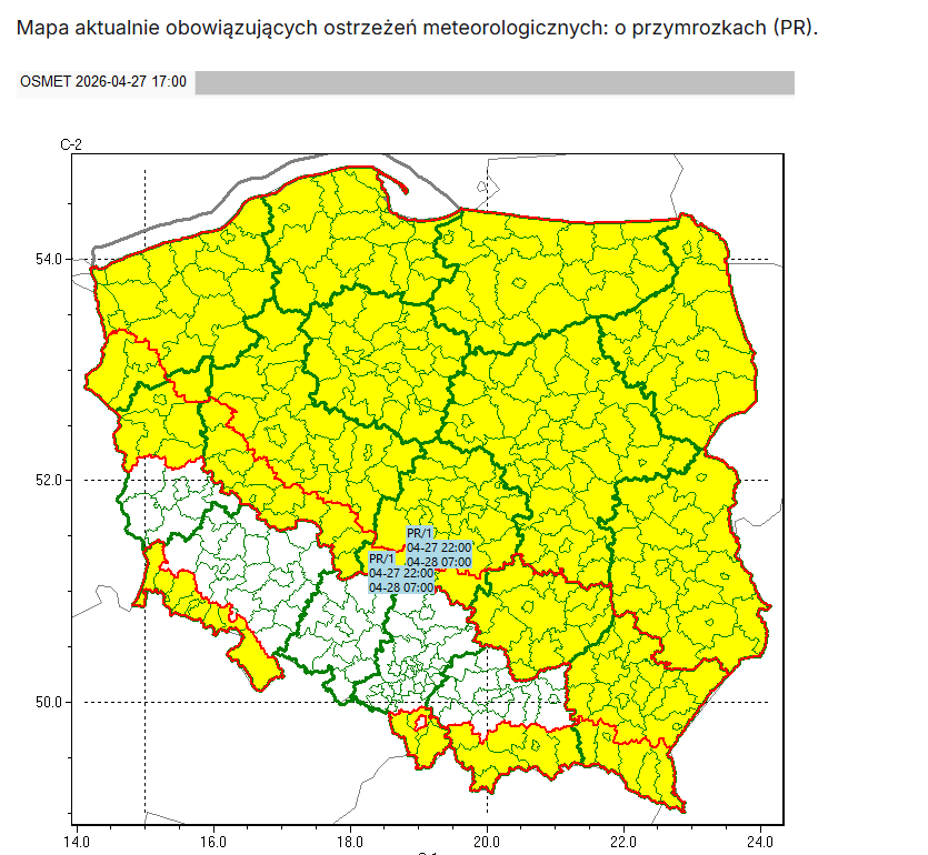 Na noc z 27 na 28 kwietnia IMGW wydał ostrzeżenia pierwszego stopnia dla bardzo dużej części kraju. Alerty objęły wszystkie powiaty w województwach: