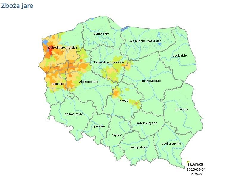 Obszary zagrożone znacznymi stratami plonów zbóż jarych odnotowano w województwach: