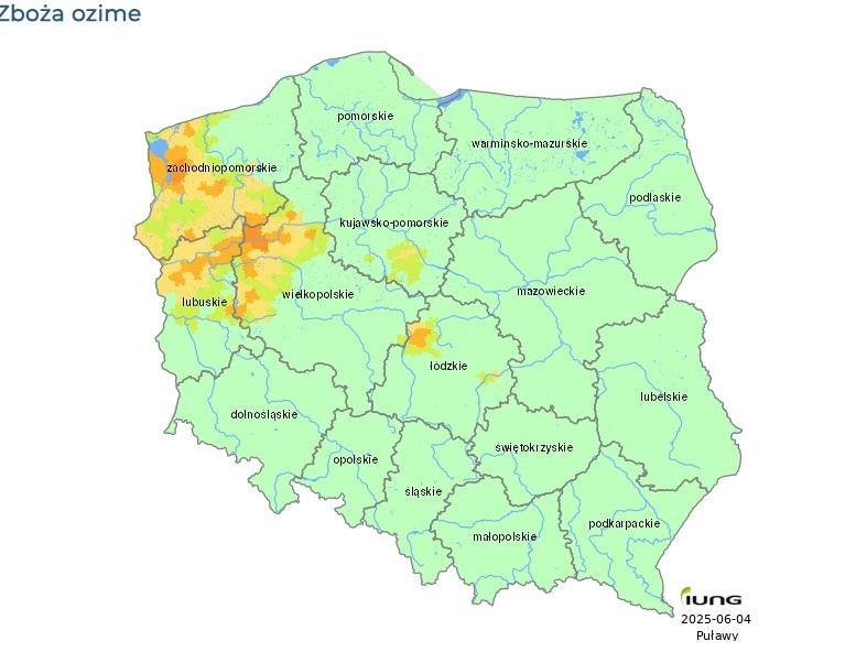 Obszary zagrożone znacznymi stratami plonów zbóż ozimych odnotowano w województwach: