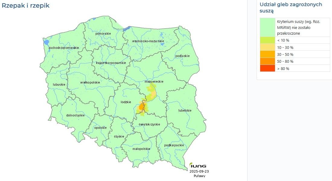Dla uprawy rzepaku, a także rzepiku susza rolnicza została stwierdzona w 39 gminach w Polsce. W nastepujących województwach: