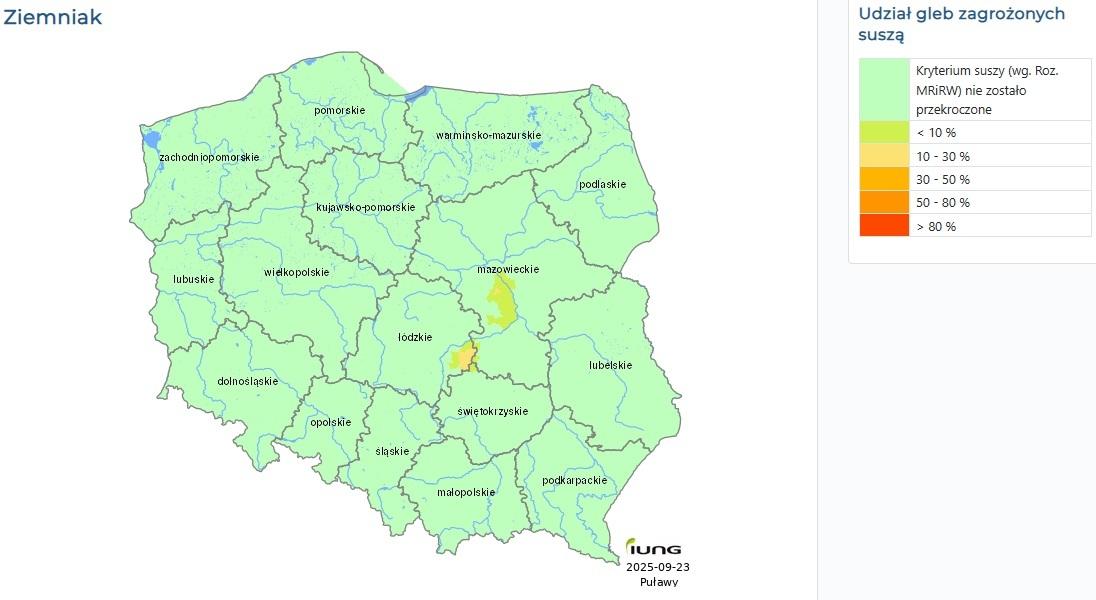 - Zgodnie z Rozporządzeniem Ministra Rolnictwa i Rozwoju Wsi z dnia 11 kwietnia 2019 r. w sprawie wartości klimatycznego bilansu wodnego dla poszczególnych gatunków roślin uprawnych i gleb, oznaczających wystąpienie suszy, w trzynastym okresie raportowania — od 21 lipca do 20 września — odnotowano na niewielkim obszarze kraju zasięgi gleb zagrożonych suszą dla upraw: ziemniaka i rzepaki i rzepiku - podaje IUNG.