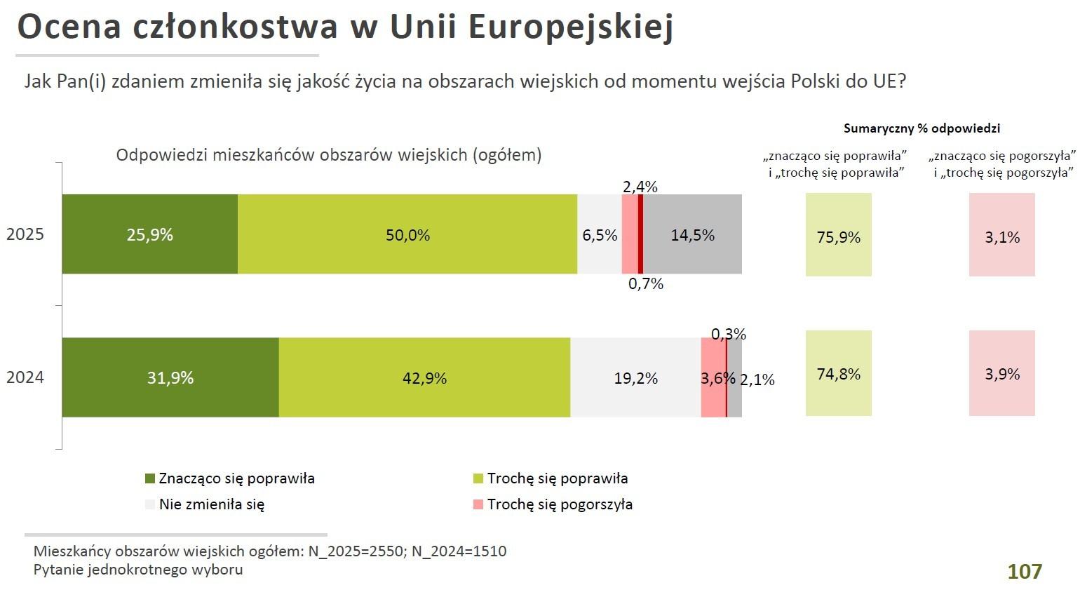 Okazuje się, że trzy czwarte mieszkańców wsi (75,9%) uważa, że od momentu wejścia Polski do Unii Europejskiej jakość życia na obszarach wiejskich uległa poprawie – wynika z badania Polska Wieś i Rolnictwo 2025, które zostało przeprowadzone we wrześniu ubiegłego roku na próbie 2550 osób.