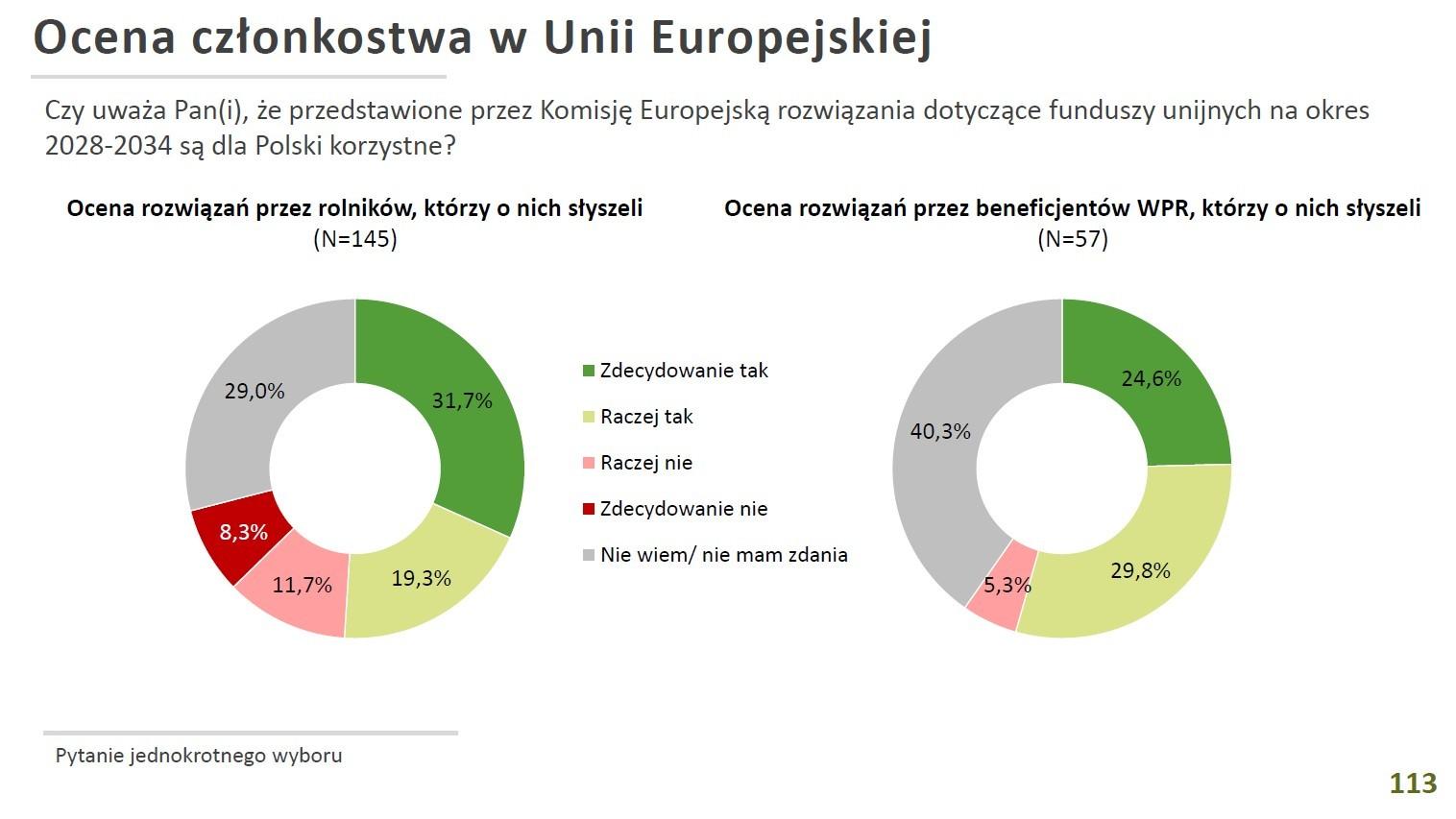 Czy uważa Pan(i), że przedstawione przez Komisję Europejską rozwiązania dotyczące funduszy unijnych na okres 2028-2034 są dla Polski korzystne? Tutaj ocena rozwiązań w gronie rolników, którzy o nich słyszeli, wygląda następująco: zdecydowanie tak – 31,7%, raczej tak – 19,3%, raczej nie – 11,7%, zdecydowanie nie – 8,3%, nie wiem/nie mam zdania – 29,0%.