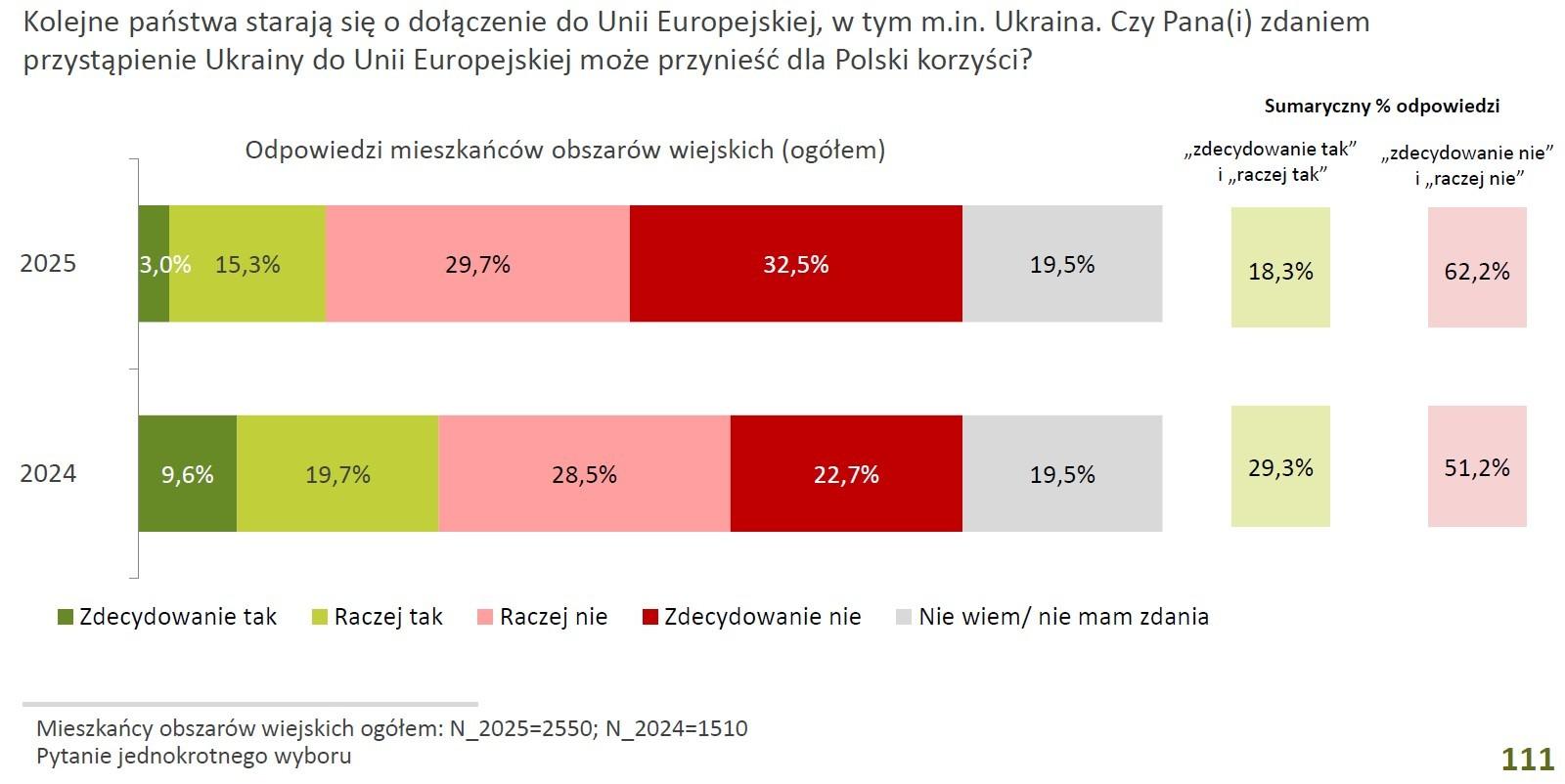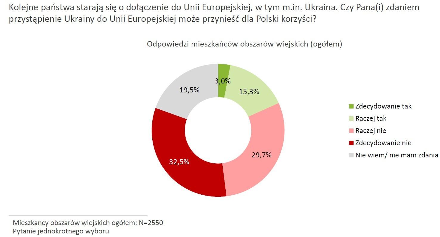 Tylko 18,3% mieszkańców obszarów wiejskich uważa, że członkostwo Ukrainy w Unii Europejskiej może być korzystne dla Polski, a 62,2% uważa, że nie przyniesie korzyści.
